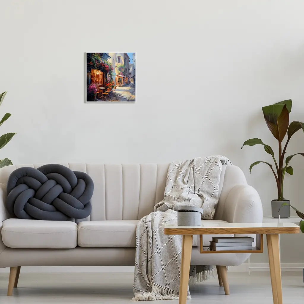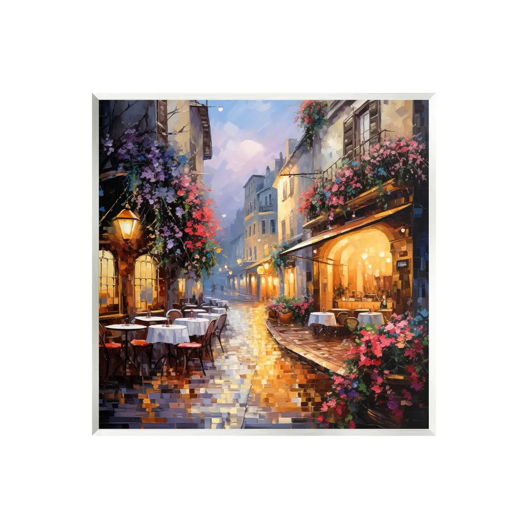 Our wall plaques start as high-quality lithograph prints mounted on durable 0.5-inch thick MDF wood. Each piece is hand finished and comes with a fresh layer of white foil on the sides to give it a crisp, clean look. Plaques arrive ready to hang without installation and come with removable plastic corners to keep them from damage in transit. Stupell Industries Wall Art is made in the USA.Features: Dimensions: 12 x 0.5 x 12 InchesWall Art is Ready to Hang with Hardware Free Hanging. No installation required. For Easy Set Up Lean or Layer Artwork on Shelf or Against Wall.All of our wall plaques start off as high quality lithograph prints that are then mounted on durable 0.5 inch thick MDF wood. Each piece is hand finished and comes with a fresh layer of foil on the sides to give it a crisp clean look. Made In USA.Artwork Relates To: City, Road, Street, Urban, Restaurant, Cafe, Path, Walkway, Flower, Flower Arrangement, Plant, NeighborhoodDesign by Ray Powers