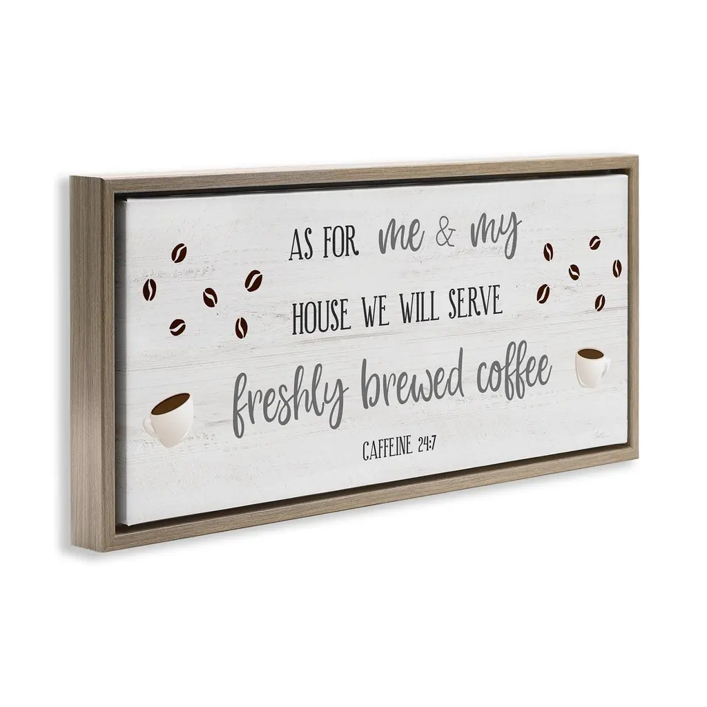 Elevate your home or office to the next level with Stupell Framed Floating Canvas Wall Art. Our premium hand-stretched canvas is mounted securely into a sturdy lightweight frame. The museum-style gap between the wrapped canvas and the box frame gives the illusion of floating artwork. Stupell Wall Art is made in the USA.Features: Dimensions: 25 x 1.7 x 11 Frame, 24 x 1.5 x 10 Canvas ArtFloating Frame Canvas Products are available in sizes 25"x11" and 31"x14". All Floating Frame Canvas Products have a 1.7" Depth.Wall Art is Ready to Hang with Hardware Free Hanging. No Installation required. For Easy Set Up Lean or Layer Artwork on Shelf or Against Wall. Artwork is Permently Fixed into the Frame.Our elevated 1.7" Thick Floating Frame is the perfect complement to our canvas style Wall Art. We use only the highest quality inks in house with industry leading printing solutions. Canvas is hand stretched over a durable wood foundation and then mounted securly into a Modern Box Frame. Made in the USA.Artwork Relates To: Phrase, Humor, Kitchen, Coffee, Mug, Spiritual, Religious, ProverbDesign by Natalie Carpentieri