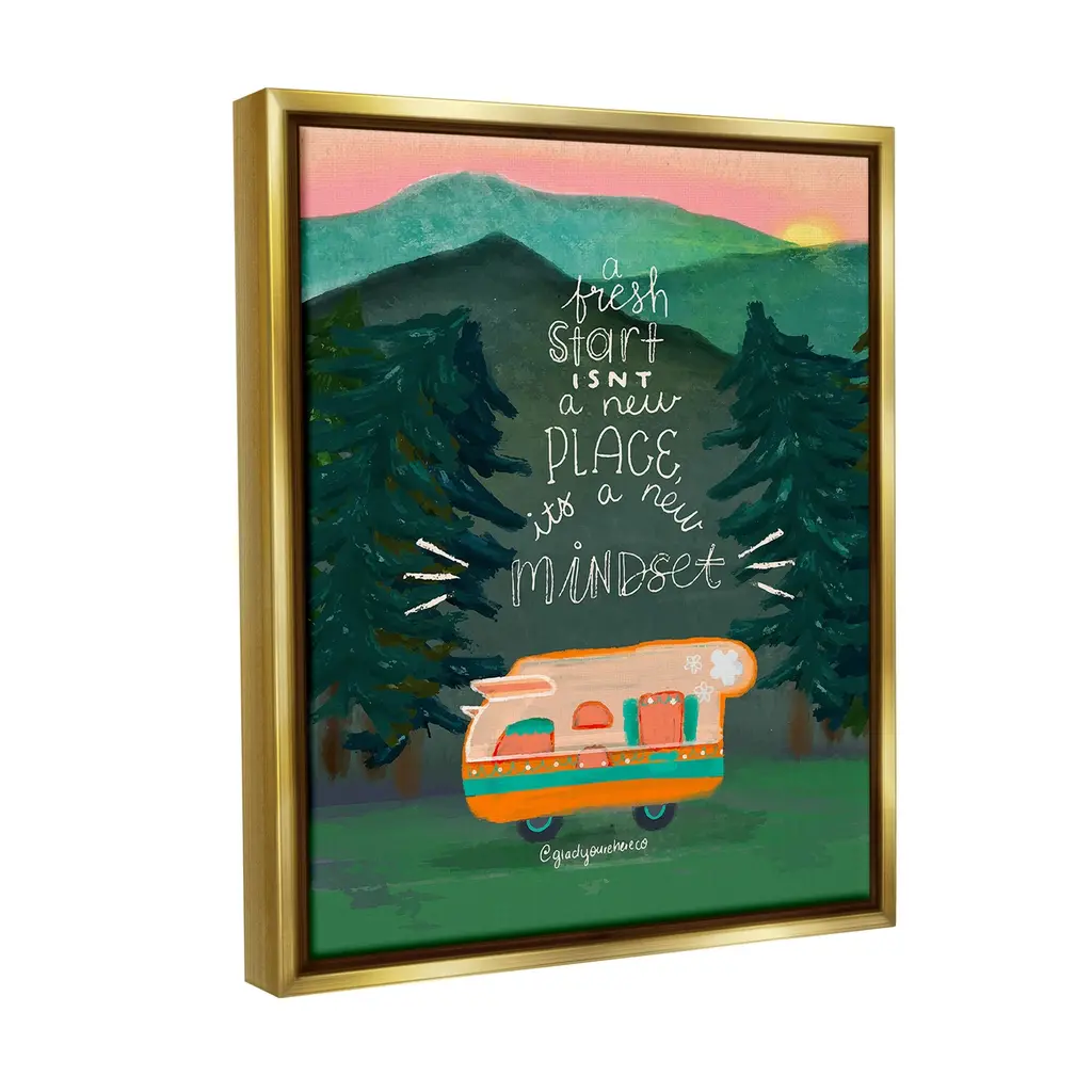 Elevate your home or office to the next level with Stupell Framed Floating Canvas Wall Art. Our premium hand-stretched canvas is mounted securely into a sturdy lightweight frame. The museum-style gap between the wrapped canvas and the box frame gives the illusion of floating artwork. Stupell Wall Art is made in the USA.Features: Dimensions: 17 x 1.7 x 21 Frame, 16 x 1.5 x 20 Canvas ArtFloating Frame Canvas Products are available in sizes 17"x21" and 25"x31". All Floating Frame Canvas Products have a 1.7" Depth.Wall Art is Ready to Hang with Hardware Free Hanging. No Installation required. For Easy Set Up Lean or Layer Artwork on Shelf or Against Wall. Artwork is Permently Fixed into the Frame.Our elevated 1.7" Thick Floating Frame is the perfect complement to our canvas style Wall Art. We use only the highest quality inks in house with industry leading printing solutions. Canvas is hand stretched over a durable wood foundation and then mounted securly into a Modern Box Frame. Made in the USA.Artwork Relates To: Plant, Tree, Vehicle, Nature, Woodland, Forest, Camping, Mountain, Phrase, A Fresh Start Isn't a New Place It's a New MindsetDesign by Glad You're Here Co.