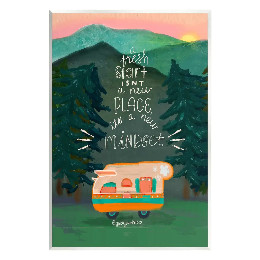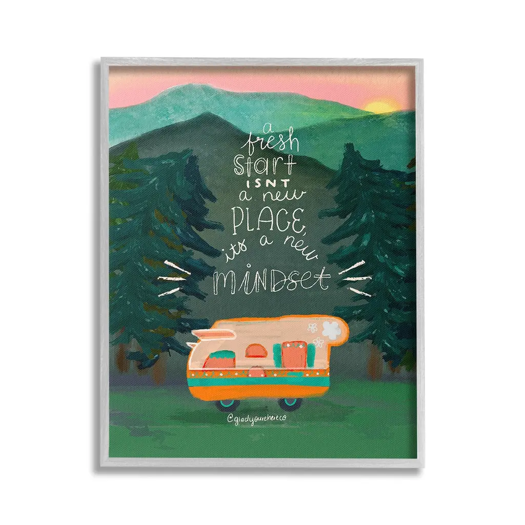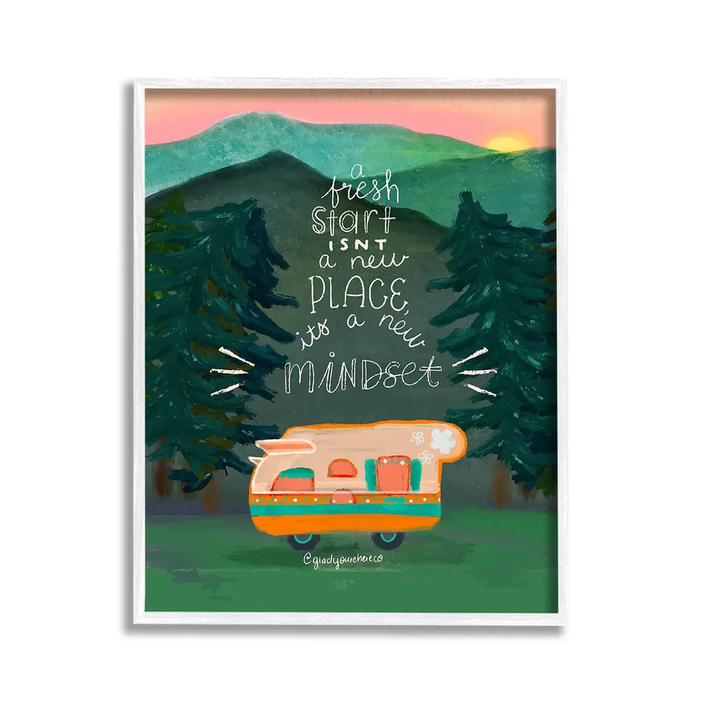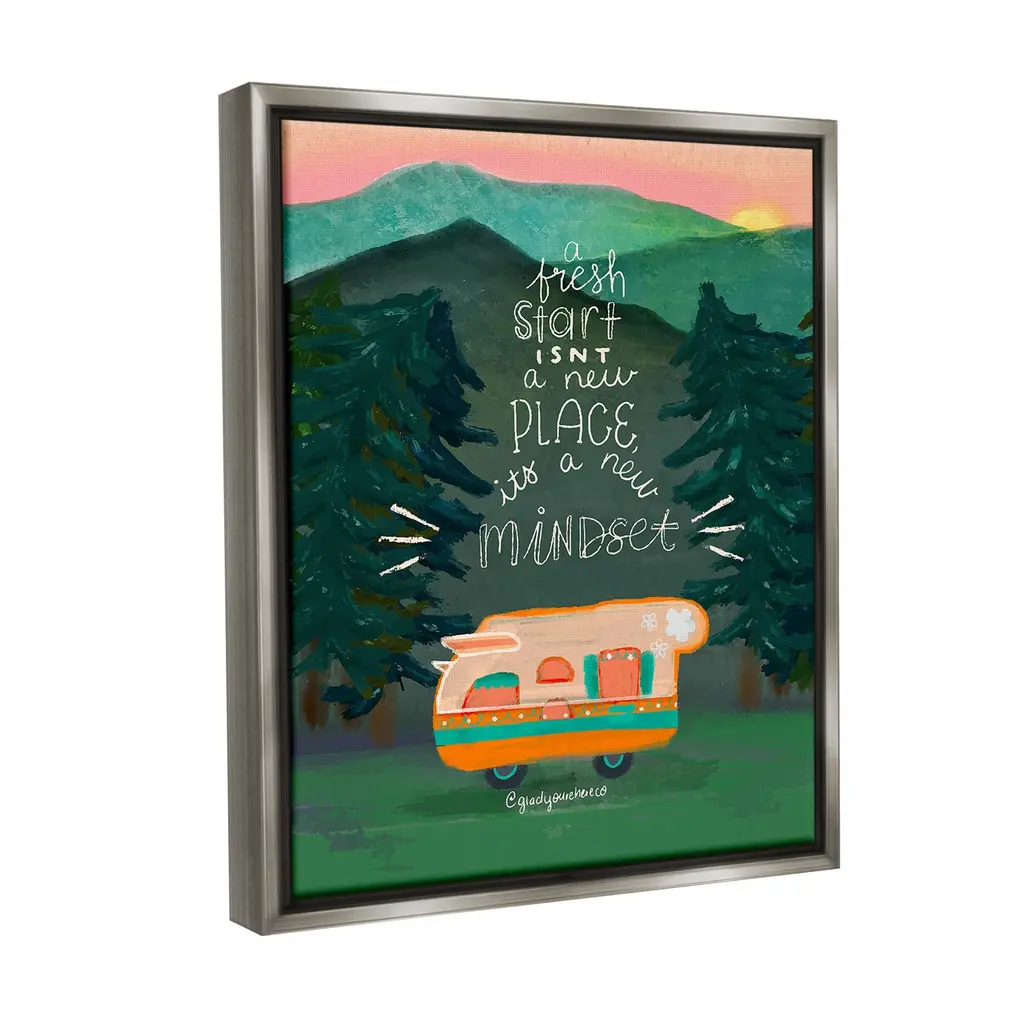 Elevate your home or office to the next level with Stupell Framed Floating Canvas Wall Art. Our premium hand-stretched canvas is mounted securely into a sturdy lightweight frame. The museum-style gap between the wrapped canvas and the box frame gives the illusion of floating artwork. Stupell Wall Art is made in the USA.Features: Dimensions: 17 x 1.7 x 21 Frame, 16 x 1.5 x 20 Canvas ArtFloating Frame Canvas Products are available in sizes 17"x21" and 25"x31". All Floating Frame Canvas Products have a 1.7" Depth.Wall Art is Ready to Hang with Hardware Free Hanging. No Installation required. For Easy Set Up Lean or Layer Artwork on Shelf or Against Wall. Artwork is Permently Fixed into the Frame.Our elevated 1.7" Thick Floating Frame is the perfect complement to our canvas style Wall Art. We use only the highest quality inks in house with industry leading printing solutions. Canvas is hand stretched over a durable wood foundation and then mounted securly into a Modern Box Frame. Made in the USA.Artwork Relates To: Plant, Tree, Vehicle, Nature, Woodland, Forest, Camping, Mountain, Phrase, A Fresh Start Isn't a New Place It's a New MindsetDesign by Glad You're Here Co.