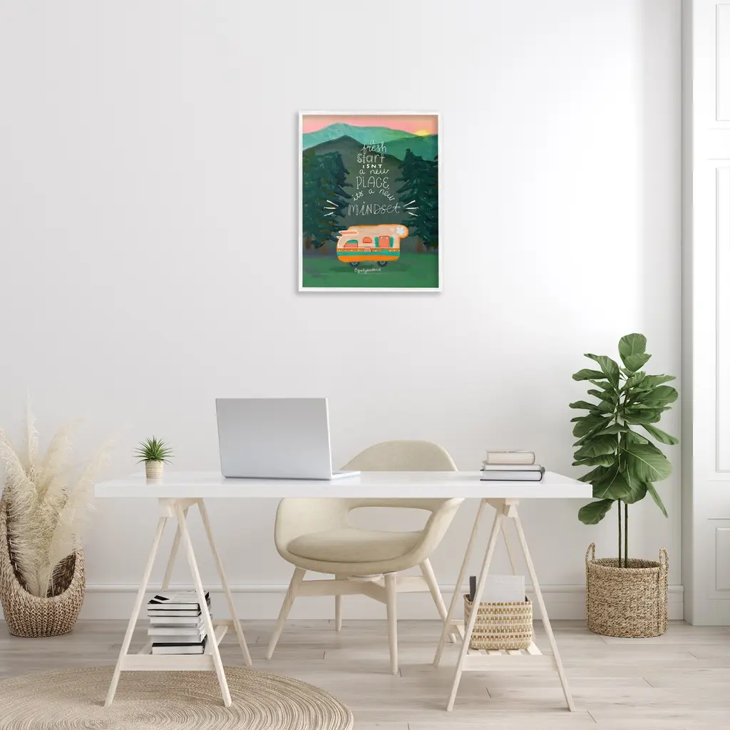Add dimension to any room with our textured Framed Giclee Artwork. Our framed artwork is securely mounted into a 1.5-inch thick wood grain frame and ready to hang. Frames are available in three alluring styles: black, gray farmhouse and white. In addition, you should check out our oversized options if you want a statement piece. Stupell Wall Art is made in the USA.Features: Dimensions: 11 x 1.5 x 14 FramedFramed Giclee Products are available in the sizes 11"x14", 16"x20" or 24"x30". All Framed Giclee Products have a 1.5" Depth. Wall Art is Ready to Hang with Hardware Free Hanging. No installation required. For Easy Set Up Lean or Layer Artwork on Shelf or Against Wall.Our giclée prints are carefully mounted on a durable MDF backing, and then perfectly finished in a 1.5 inch thick woodgrain frame. Mounted frame colors include black, gray farmhouse and white. Made In USA.Artwork Relates To: Plant, Tree, Vehicle, Nature, Woodland, Forest, Camping, Mountain, Phrase, A Fresh Start Isn't a New Place It's a New MindsetDesign by Glad You're Here Co.