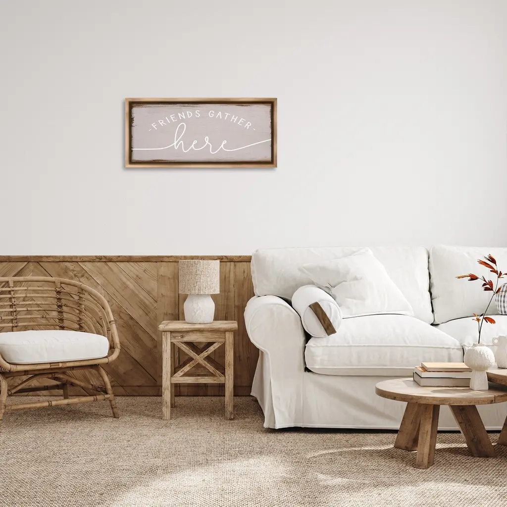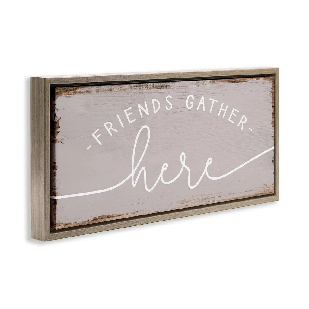 Elevate your home or office to the next level with Stupell Framed Floating Canvas Wall Art. Our premium hand-stretched canvas is mounted securely into a sturdy lightweight frame. The museum-style gap between the wrapped canvas and the box frame gives the illusion of floating artwork. Stupell Wall Art is made in the USA.Features: Dimensions: 25 x 1.7 x 11 Frame, 24 x 1.5 x 10 Canvas ArtFloating Frame Canvas Products are available in sizes 25"x11" and 31"x14". All Floating Frame Canvas Products have a 1.7" Depth.Wall Art is Ready to Hang with Hardware Free Hanging. No Installation required. For Easy Set Up Lean or Layer Artwork on Shelf or Against Wall. Artwork is Permently Fixed into the Frame.Our elevated 1.7" Thick Floating Frame is the perfect complement to our canvas style Wall Art. We use only the highest quality inks in house with industry leading printing solutions. Canvas is hand stretched over a durable wood foundation and then mounted securly into a Modern Box Frame. Made in the USA.Artwork Relates To: Phrase, Family, Friends, Gather, Rustic, DistressedDesign by Daphne Polselli