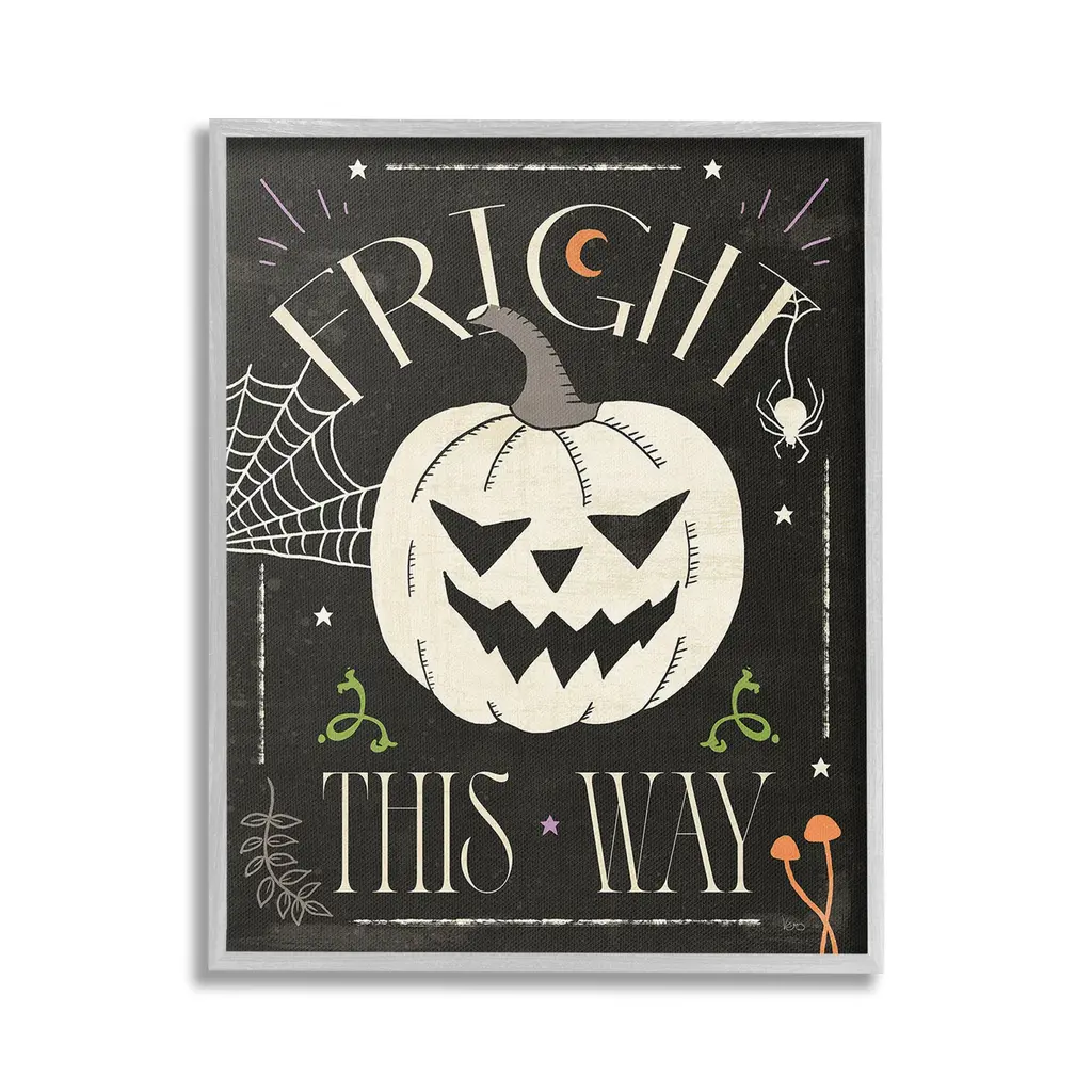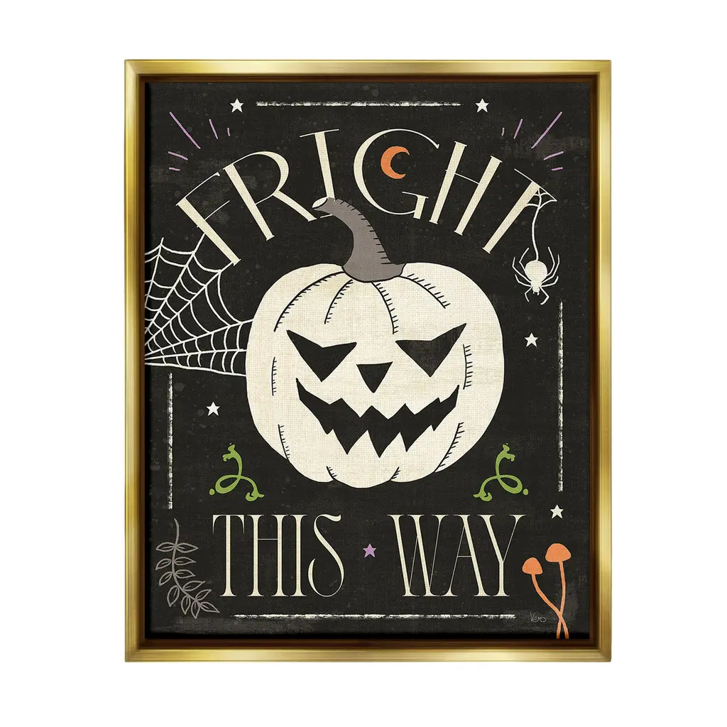 Elevate your home or office to the next level with Stupell Framed Floating Canvas Wall Art. Our premium hand-stretched canvas is mounted securely into a sturdy lightweight frame. The museum-style gap between the wrapped canvas and the box frame gives the illusion of floating artwork. Stupell Wall Art is made in the USA.Features: Dimensions: 17 x 1.7 x 21 Frame, 16 x 1.5 x 20 Canvas ArtFloating Frame Canvas Products are available in sizes 17"x21" and 25"x31". All Floating Frame Canvas Products have a 1.7" Depth.Wall Art is Ready to Hang with Hardware Free Hanging. No Installation required. For Easy Set Up Lean or Layer Artwork on Shelf or Against Wall. Artwork is Permently Fixed into the Frame.Our elevated 1.7" Thick Floating Frame is the perfect complement to our canvas style Wall Art. We use only the highest quality inks in house with industry leading printing solutions. Canvas is hand stretched over a durable wood foundation and then mounted securly into a Modern Box Frame. Made in the USA.Artwork Relates To: Festival, Halloween, Botanical, Leaf, Jack-o-Lantern, Pumpkin, Spider, Stars, Web, Moon, Fright This WayDesign by Veronique Charron