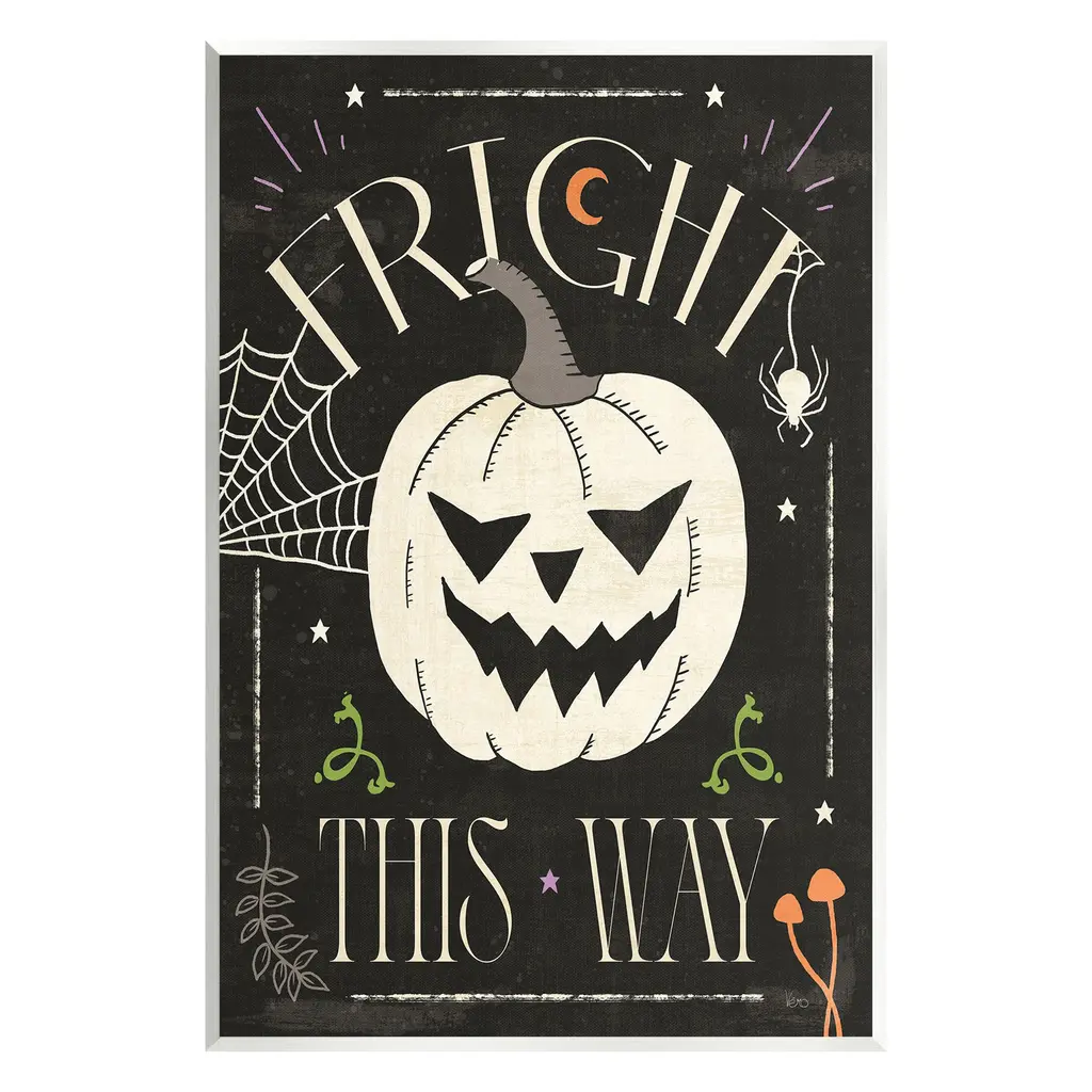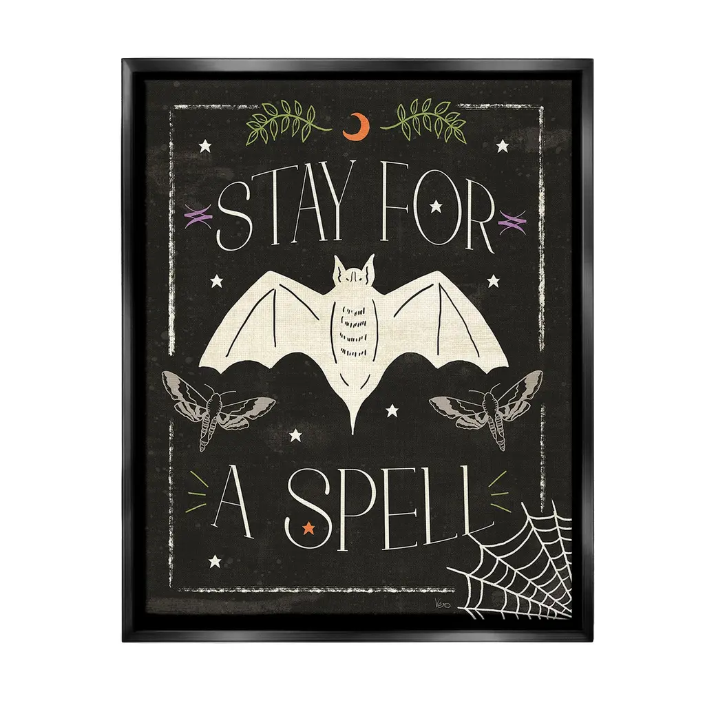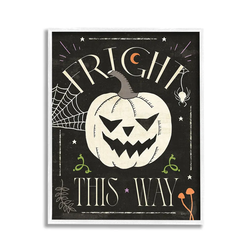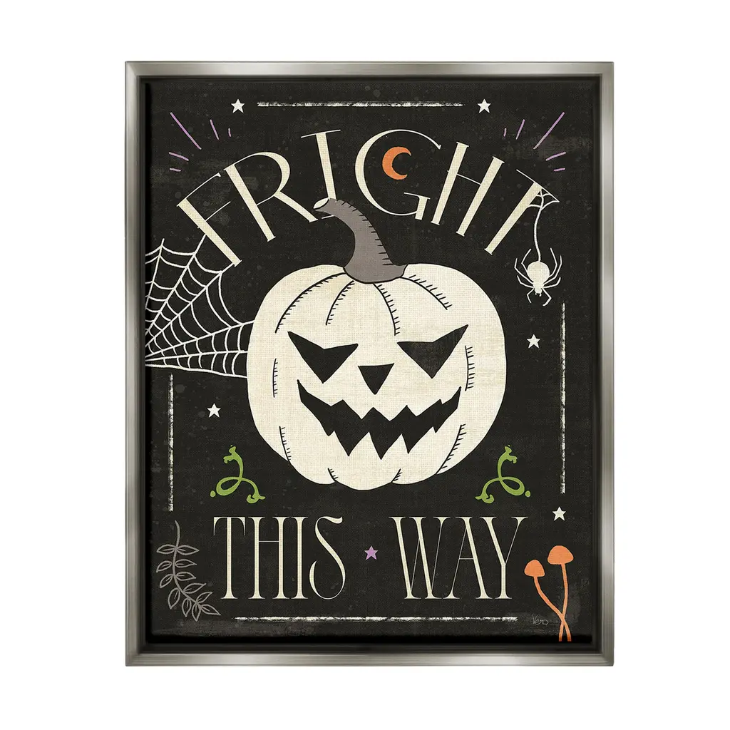 Elevate your home or office to the next level with Stupell Framed Floating Canvas Wall Art. Our premium hand-stretched canvas is mounted securely into a sturdy lightweight frame. The museum-style gap between the wrapped canvas and the box frame gives the illusion of floating artwork. Stupell Wall Art is made in the USA.Features: Dimensions: 17 x 1.7 x 21 Frame, 16 x 1.5 x 20 Canvas ArtFloating Frame Canvas Products are available in sizes 17"x21" and 25"x31". All Floating Frame Canvas Products have a 1.7" Depth.Wall Art is Ready to Hang with Hardware Free Hanging. No Installation required. For Easy Set Up Lean or Layer Artwork on Shelf or Against Wall. Artwork is Permently Fixed into the Frame.Our elevated 1.7" Thick Floating Frame is the perfect complement to our canvas style Wall Art. We use only the highest quality inks in house with industry leading printing solutions. Canvas is hand stretched over a durable wood foundation and then mounted securly into a Modern Box Frame. Made in the USA.Artwork Relates To: Festival, Halloween, Botanical, Leaf, Jack-o-Lantern, Pumpkin, Spider, Stars, Web, Moon, Fright This WayDesign by Veronique Charron