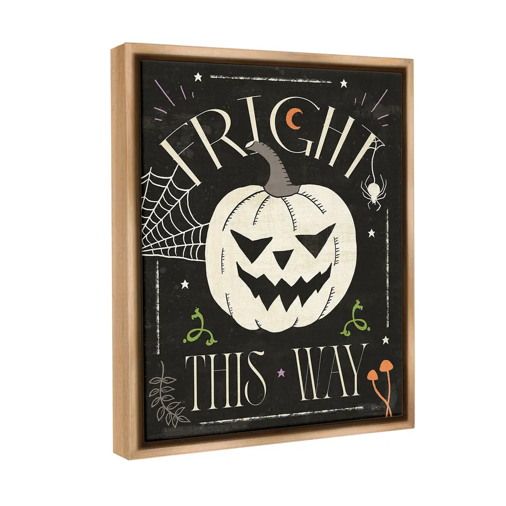 Elevate your home or office to the next level with Stupell Framed Floating Canvas Wall Art. Our premium hand-stretched canvas is mounted securely into a sturdy lightweight frame. The museum-style gap between the wrapped canvas and the box frame gives the illusion of floating artwork. Stupell Wall Art is made in the USA.Features: Dimensions: 17 x 1.7 x 21 Frame, 16 x 1.5 x 20 Canvas ArtFloating Frame Canvas Products are available in sizes 17"x21" and 25"x31". All Floating Frame Canvas Products have a 1.7" Depth.Wall Art is Ready to Hang with Hardware Free Hanging. No Installation required. For Easy Set Up Lean or Layer Artwork on Shelf or Against Wall. Artwork is Permently Fixed into the Frame.Our elevated 1.7" Thick Floating Frame is the perfect complement to our canvas style Wall Art. We use only the highest quality inks in house with industry leading printing solutions. Canvas is hand stretched over a durable wood foundation and then mounted securly into a Modern Box Frame. Made in the USA.Artwork Relates To: Festival, Halloween, Botanical, Leaf, Jack-o-Lantern, Pumpkin, Spider, Stars, Web, Moon, Fright This WayDesign by Veronique Charron