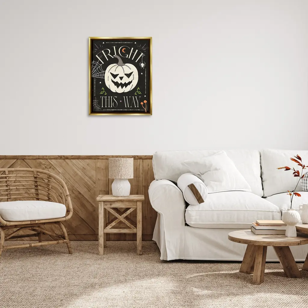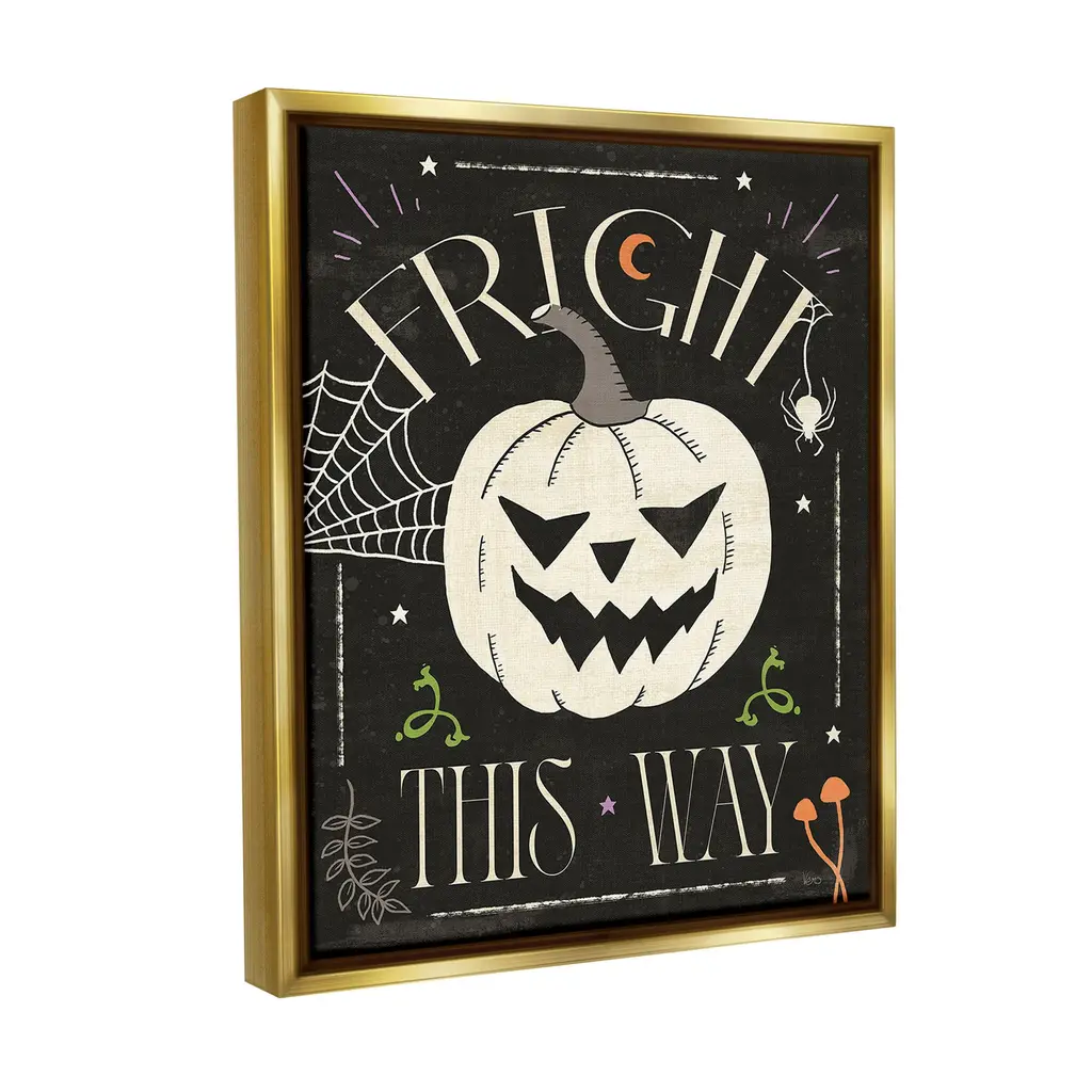 Elevate your home or office to the next level with Stupell Framed Floating Canvas Wall Art. Our premium hand-stretched canvas is mounted securely into a sturdy lightweight frame. The museum-style gap between the wrapped canvas and the box frame gives the illusion of floating artwork. Stupell Wall Art is made in the USA.Features: Dimensions: 17 x 1.7 x 21 Frame, 16 x 1.5 x 20 Canvas ArtFloating Frame Canvas Products are available in sizes 17"x21" and 25"x31". All Floating Frame Canvas Products have a 1.7" Depth.Wall Art is Ready to Hang with Hardware Free Hanging. No Installation required. For Easy Set Up Lean or Layer Artwork on Shelf or Against Wall. Artwork is Permently Fixed into the Frame.Our elevated 1.7" Thick Floating Frame is the perfect complement to our canvas style Wall Art. We use only the highest quality inks in house with industry leading printing solutions. Canvas is hand stretched over a durable wood foundation and then mounted securly into a Modern Box Frame. Made in the USA.Artwork Relates To: Festival, Halloween, Botanical, Leaf, Jack-o-Lantern, Pumpkin, Spider, Stars, Web, Moon, Fright This WayDesign by Veronique Charron