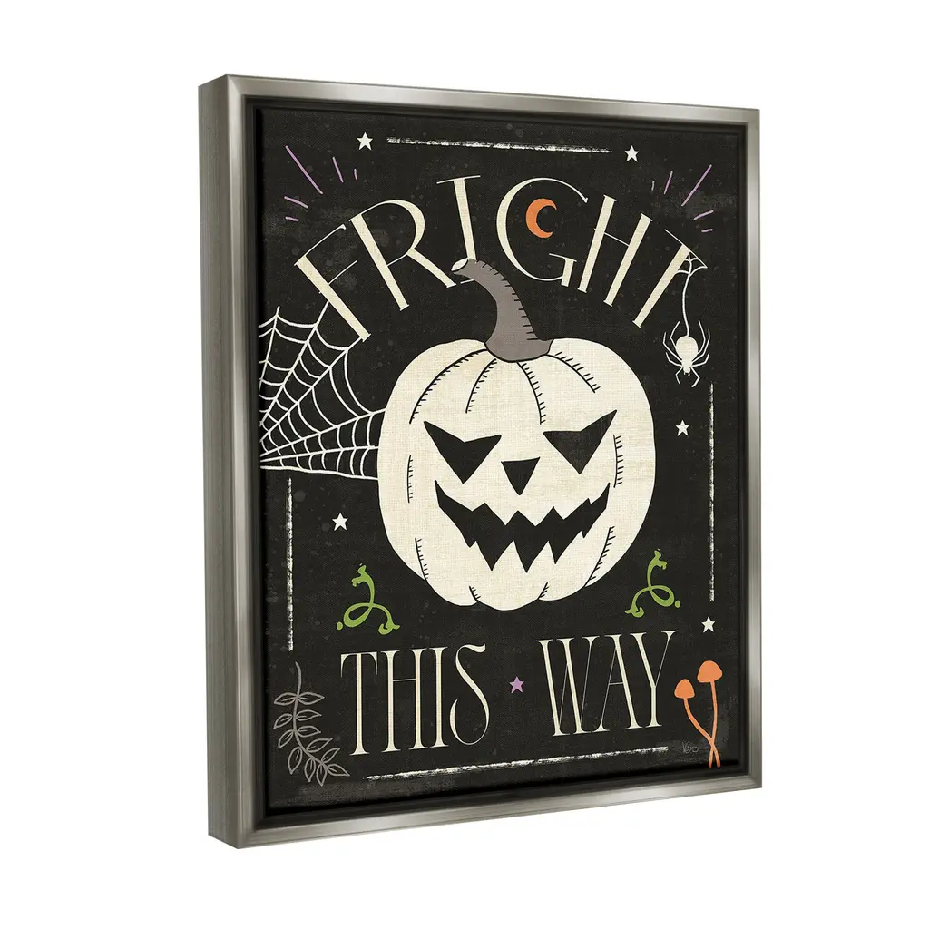 Elevate your home or office to the next level with Stupell Framed Floating Canvas Wall Art. Our premium hand-stretched canvas is mounted securely into a sturdy lightweight frame. The museum-style gap between the wrapped canvas and the box frame gives the illusion of floating artwork. Stupell Wall Art is made in the USA.Features: Dimensions: 17 x 1.7 x 21 Frame, 16 x 1.5 x 20 Canvas ArtFloating Frame Canvas Products are available in sizes 17"x21" and 25"x31". All Floating Frame Canvas Products have a 1.7" Depth.Wall Art is Ready to Hang with Hardware Free Hanging. No Installation required. For Easy Set Up Lean or Layer Artwork on Shelf or Against Wall. Artwork is Permently Fixed into the Frame.Our elevated 1.7" Thick Floating Frame is the perfect complement to our canvas style Wall Art. We use only the highest quality inks in house with industry leading printing solutions. Canvas is hand stretched over a durable wood foundation and then mounted securly into a Modern Box Frame. Made in the USA.Artwork Relates To: Festival, Halloween, Botanical, Leaf, Jack-o-Lantern, Pumpkin, Spider, Stars, Web, Moon, Fright This WayDesign by Veronique Charron
