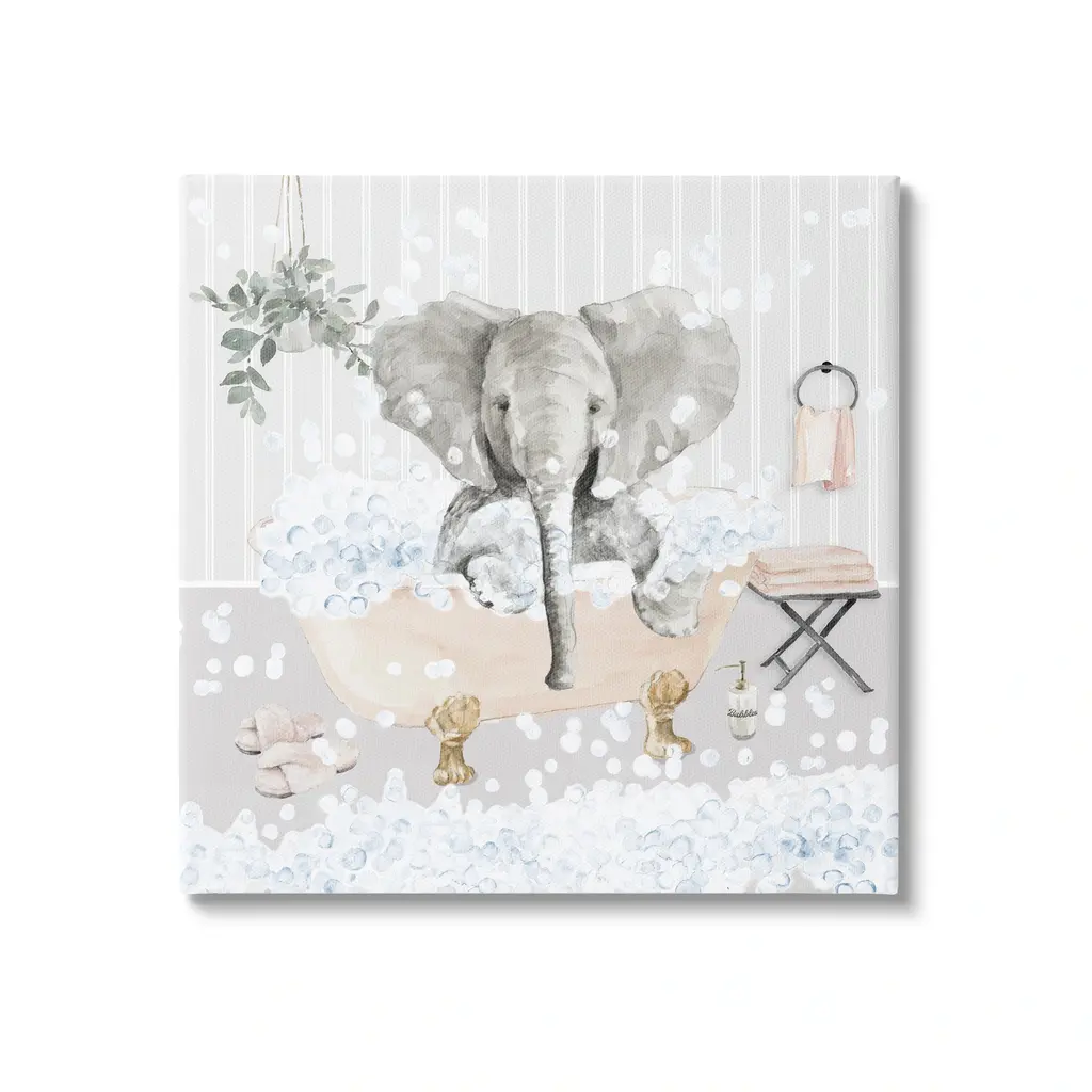 Proudly made in the USA, Our stretched canvas is created with the highest standards. We use only the highest quality inks and canvas on our in house Mimaki printers, and then hand cut and stretch each piece over a 1.5 inch thick wooden frame for hanging. The art comes ready to hang with no installation required. Room Type: Bathroom, Powder Room, Vanity, Rest Room or Wash Room.Features: Dimensions: 17 x 1.5 x 17 InchesStretched Canvas Sizes Include Standard: 17 x 1.5 x 17 Large: 24 x 1.5 x 24 X-Large: 30 x 1.5 x 30 Oversized: 36 x 1.5 x 36Wall Art is Ready to Hang - No Installation or Hardware Needed. For Easy Set Up Lean or Layer Artwork on Shelf or Against Wall.Our stretched canvas is created with the highest standards. We use only the highest quality inks and canvas on our in house Mimaki printers, and then hand cut and stretch each piece over a 1.5 inch thick wooden frame for hanging. Made In USA.Artwork Relates To: Bathing, Bathtub, Tub, Animal, Mammal, Bathroom, ElephantDesign by Lanie Loreth