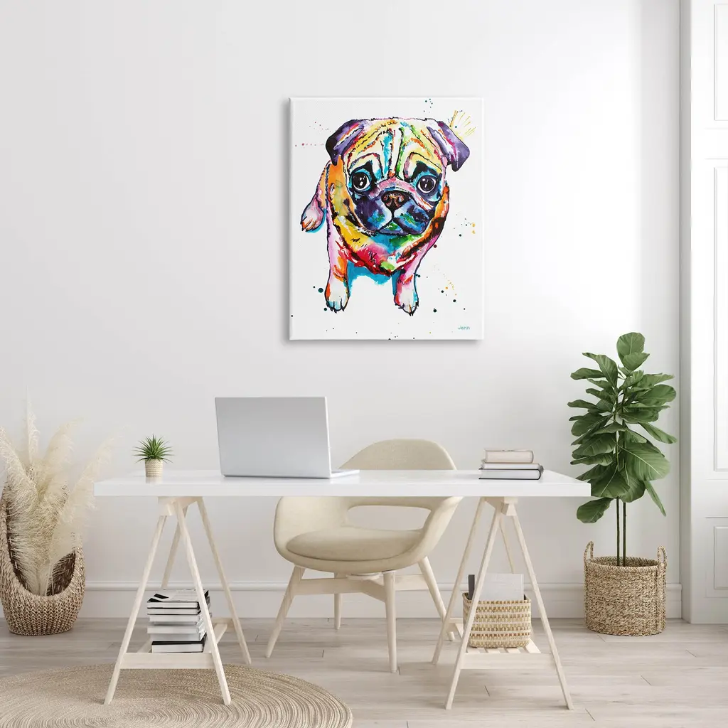 Proudly made in the USA, Our stretched canvas is created with the highest standards. We use only the highest quality inks and canvas on our in house Mimaki printers, and then hand cut and stretch each piece over a 1.5 inch thick wooden frame for hanging. The art comes ready to hang with no installation required.Features: Dimensions: 16 x 1.5 x 20 InchesStretched Canvas Sizes Include Standard: 16 x 1.5 x 20 Large: 20 x 1.5 x 30 X-Large: 30 x 1.5 x 40 Oversized: 36 x 1.5 x 48Wall Art is Ready to Hang - No Installation or Hardware Needed. For Easy Set Up Lean or Layer Artwork on Shelf or Against Wall.Our stretched canvas is created with the highest standards. We use only the highest quality inks and canvas on our in house Mimaki printers, and then hand cut and stretch each piece over a 1.5 inch thick wooden frame for hanging. Made In USA.Artwork Relates To: Modern, Canine, Animal, Mammal, Pet, Dog, Puppy, Portrait, PugDesign by Jen Seeley