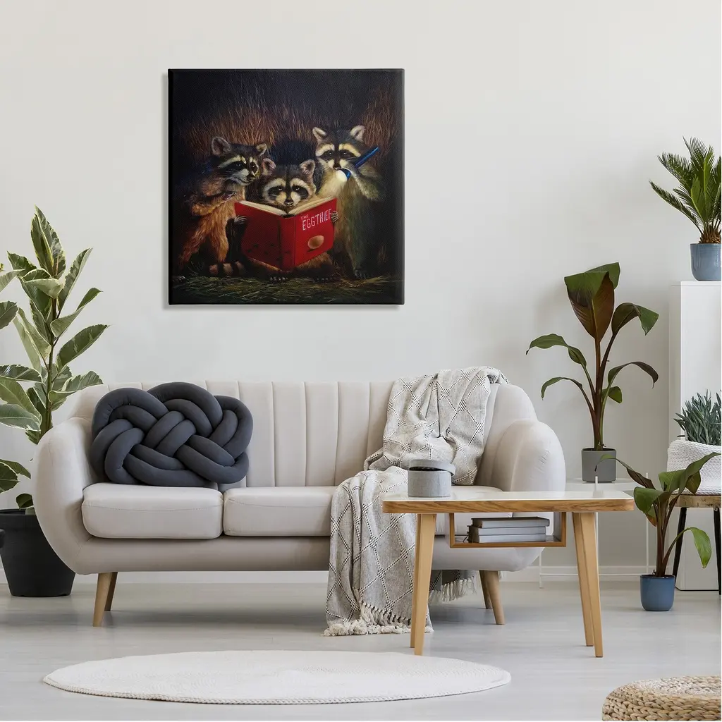 Proudly made in the USA, Our stretched canvas is created with the highest standards. We use only the highest quality inks and canvas on our in house Mimaki printers, and then hand cut and stretch each piece over a 1.5 inch thick wooden frame for hanging. The art comes ready to hang with no installation required. Room Type: Living Room, Den, Hallway, Office, Entryway, Study, Dining Room or Bedroom, Guest Room, Studio, Dorm or BoudoirFeatures: Dimensions: 17 x 1.5 x 17 InchesStretched Canvas Sizes Include Standard: 17 x 1.5 x 17 Large: 24 x 1.5 x 24 X-Large: 30 x 1.5 x 30 Oversized: 36 x 1.5 x 36Wall Art is Ready to Hang - No Installation or Hardware Needed. For Easy Set Up Lean or Layer Artwork on Shelf or Against Wall.Our stretched canvas is created with the highest standards. We use only the highest quality inks and canvas on our in house Mimaki printers, and then hand cut and stretch each piece over a 1.5 inch thick wooden frame for hanging. Made In USA.Artwork Relates To: Animal, Mammal, Raccoon, The Egg Thief, NightDesign by Lucia Heffernan