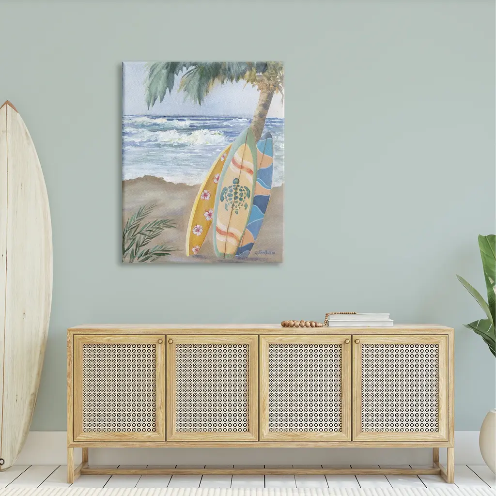 Proudly made in the USA, Our stretched canvas is created with the highest standards. We use only the highest quality inks and canvas on our in house Mimaki printers, and then hand cut and stretch each piece over a 1.5 inch thick wooden frame for hanging. The art comes ready to hang with no installation required. Room Type: Living Room, Den, Hallway, Office, Entryway, Study, Dining Room or Bedroom, Guest Room, Studio, Dorm or BoudoirFeatures: Dimensions: 16 x 1.5 x 20 InchesStretched Canvas Sizes Include Standard: 16 x 1.5 x 20 Large: 20 x 1.5 x 30 X-Large: 30 x 1.5 x 40 Oversized: 36 x 1.5 x 48Wall Art is Ready to Hang - No Installation or Hardware Needed. For Easy Set Up Lean or Layer Artwork on Shelf or Against Wall.Our stretched canvas is created with the highest standards. We use only the highest quality inks and canvas on our in house Mimaki printers, and then hand cut and stretch each piece over a 1.5 inch thick wooden frame for hanging. Made In USA.Artwork Relates To: Nature, Outdoors, Sea, Water, Sea Waves, Sport, Surfing, Surfboard, Beach, Coast, Shoreline, SummerDesign by Pam Britton