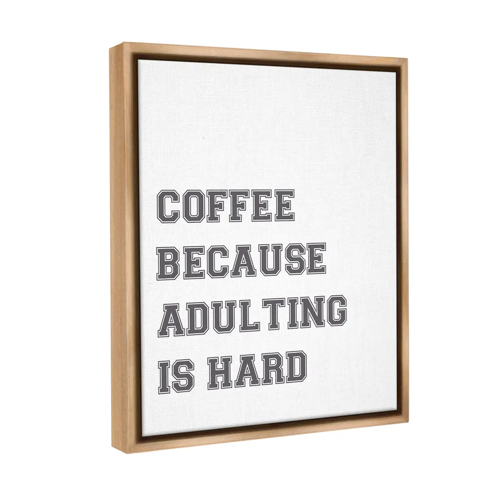 Elevate your home or office to the next level with Stupell Framed Floating Canvas Wall Art. Our premium hand-stretched canvas is mounted securely into a sturdy lightweight frame. The museum-style gap between the wrapped canvas and the box frame gives the illusion of floating artwork. Stupell Wall Art is made in the USA.Features: Dimensions: 17 x 1.7 x 21 Frame, 16 x 1.5 x 20 Canvas ArtFloating Frame Canvas Products are available in sizes 17"x21" and 25"x31". All Floating Frame Canvas Products have a 1.7" Depth.Wall Art is Ready to Hang with Hardware Free Hanging. No Installation required. For Easy Set Up Lean or Layer Artwork on Shelf or Against Wall. Artwork is Permently Fixed into the Frame.Our elevated 1.7" Thick Floating Frame is the perfect complement to our canvas style Wall Art. We use only the highest quality inks in house with industry leading printing solutions. Canvas is hand stretched over a durable wood foundation and then mounted securly into a Modern Box Frame. Made in the USA.Artwork Relates To: Phrase, Humor, Funny, Coffee, Morning, Work, Coffee Because Adulting is HardDesign by Lil' Rue