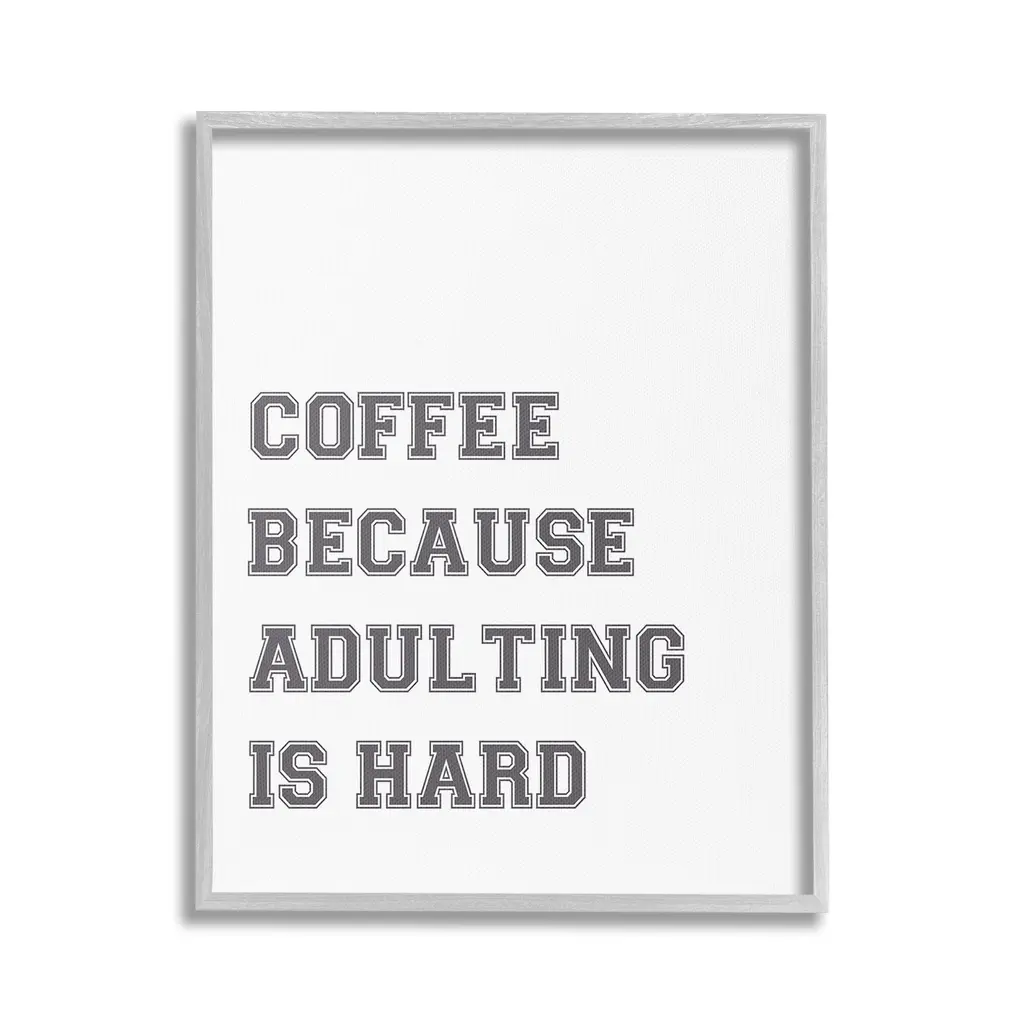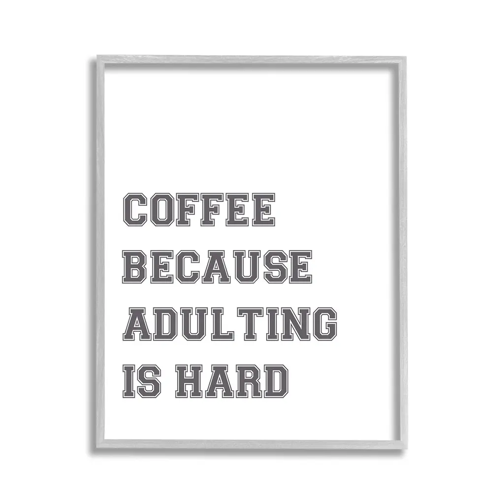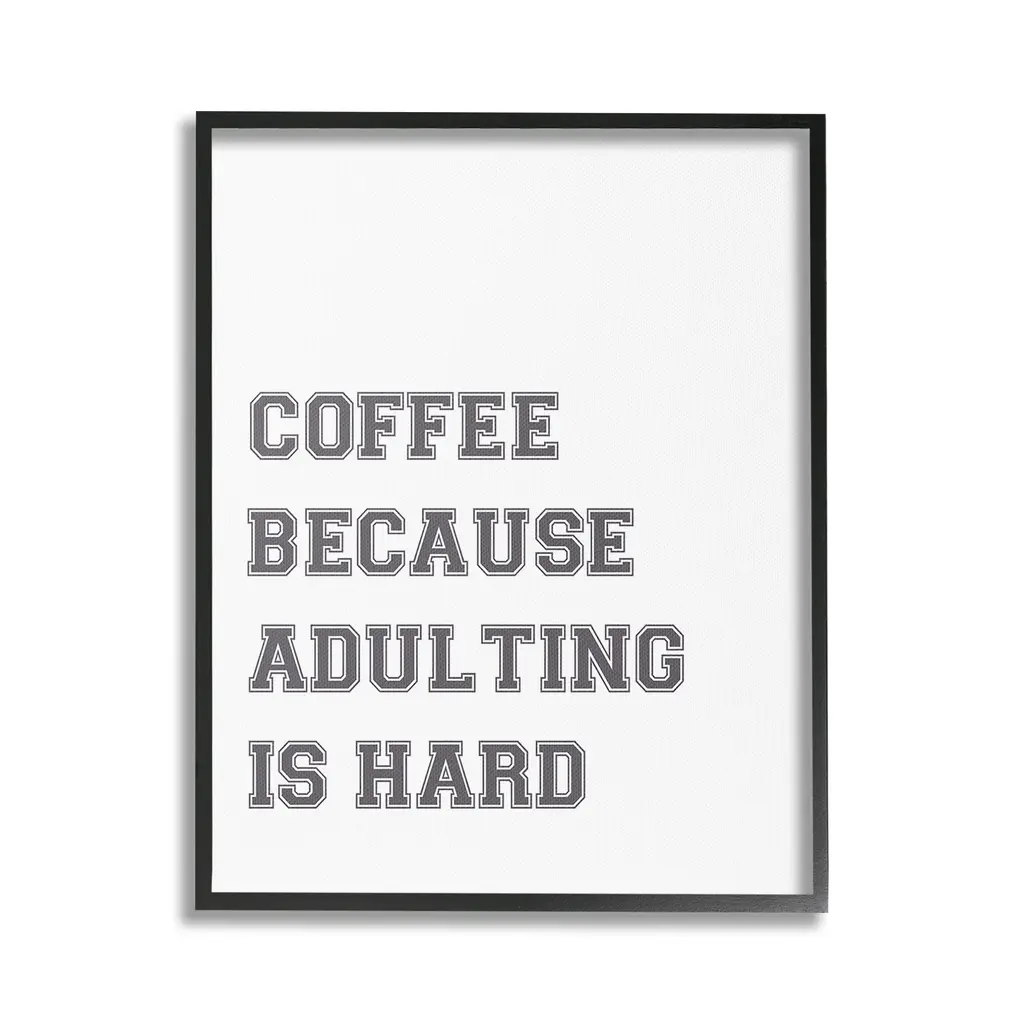 Add dimension to any room with our textured Framed Giclee Artwork. Our framed artwork is securely mounted into a 1.5-inch thick wood grain frame and ready to hang. Frames are available in three alluring styles: black, gray farmhouse and white. In addition, you should check out our oversized options if you want a statement piece. Stupell Wall Art is made in the USA.Features: Dimensions: 11 x 1.5 x 14 FramedFramed Giclee Products are available in the sizes 11"x14", 16"x20" or 24"x30". All Framed Giclee Products have a 1.5" Depth. Wall Art is Ready to Hang with Hardware Free Hanging. No installation required. For Easy Set Up Lean or Layer Artwork on Shelf or Against Wall.Our giclée prints are carefully mounted on a durable MDF backing, and then perfectly finished in a 1.5 inch thick woodgrain frame. Mounted frame colors include black, gray farmhouse and white. Made In USA.Artwork Relates To: Phrase, Humor, Funny, Coffee, Morning, Work, Coffee Because Adulting is HardDesign by Lil' Rue