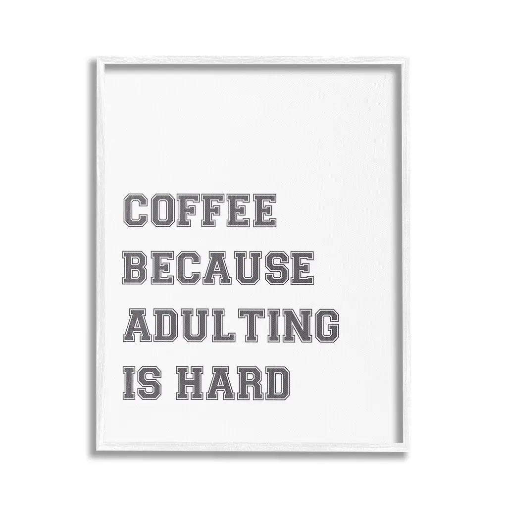 Add dimension to any room with our textured Framed Giclee Artwork. Our framed artwork is securely mounted into a 1.5-inch thick wood grain frame and ready to hang. Frames are available in three alluring styles: black, gray farmhouse and white. In addition, you should check out our oversized options if you want a statement piece. Stupell Wall Art is made in the USA.Features: Dimensions: 11 x 1.5 x 14 FramedFramed Giclee Products are available in the sizes 11"x14", 16"x20" or 24"x30". All Framed Giclee Products have a 1.5" Depth. Wall Art is Ready to Hang with Hardware Free Hanging. No installation required. For Easy Set Up Lean or Layer Artwork on Shelf or Against Wall.Our giclée prints are carefully mounted on a durable MDF backing, and then perfectly finished in a 1.5 inch thick woodgrain frame. Mounted frame colors include black, gray farmhouse and white. Made In USA.Artwork Relates To: Phrase, Humor, Funny, Coffee, Morning, Work, Coffee Because Adulting is HardDesign by Lil' Rue