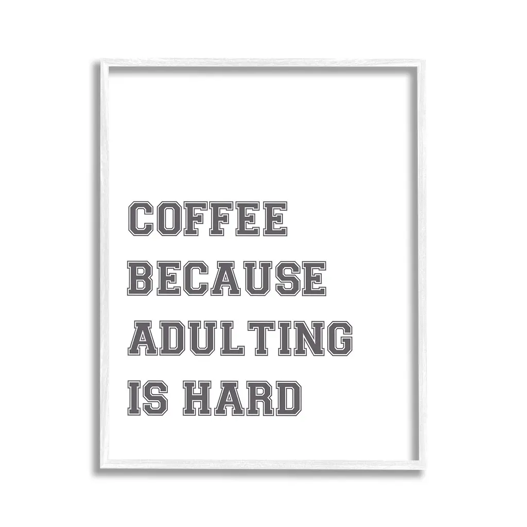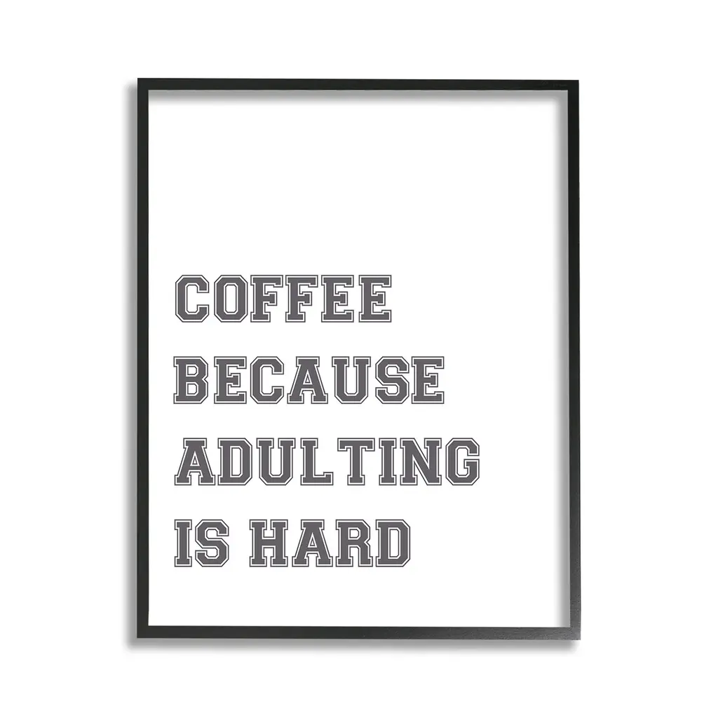 Add dimension to any room with our textured Framed Giclee Artwork. Our framed artwork is securely mounted into a 1.5-inch thick wood grain frame and ready to hang. Frames are available in three alluring styles: black, gray farmhouse and white. In addition, you should check out our oversized options if you want a statement piece. Stupell Wall Art is made in the USA.Features: Dimensions: 11 x 1.5 x 14 FramedFramed Giclee Products are available in the sizes 11"x14", 16"x20" or 24"x30". All Framed Giclee Products have a 1.5" Depth. Wall Art is Ready to Hang with Hardware Free Hanging. No installation required. For Easy Set Up Lean or Layer Artwork on Shelf or Against Wall.Our giclée prints are carefully mounted on a durable MDF backing, and then perfectly finished in a 1.5 inch thick woodgrain frame. Mounted frame colors include black, gray farmhouse and white. Made In USA.Artwork Relates To: Phrase, Humor, Funny, Coffee, Morning, Work, Coffee Because Adulting is HardDesign by Lil' Rue