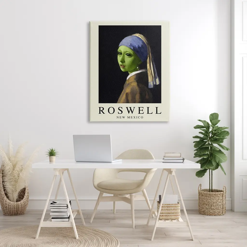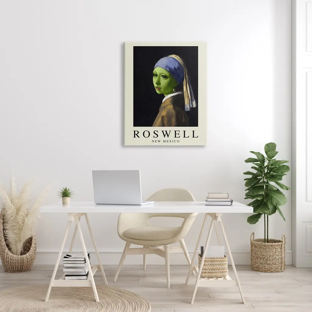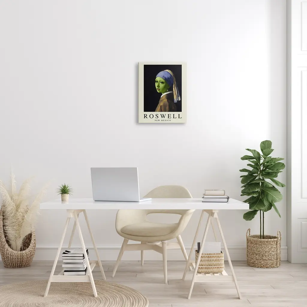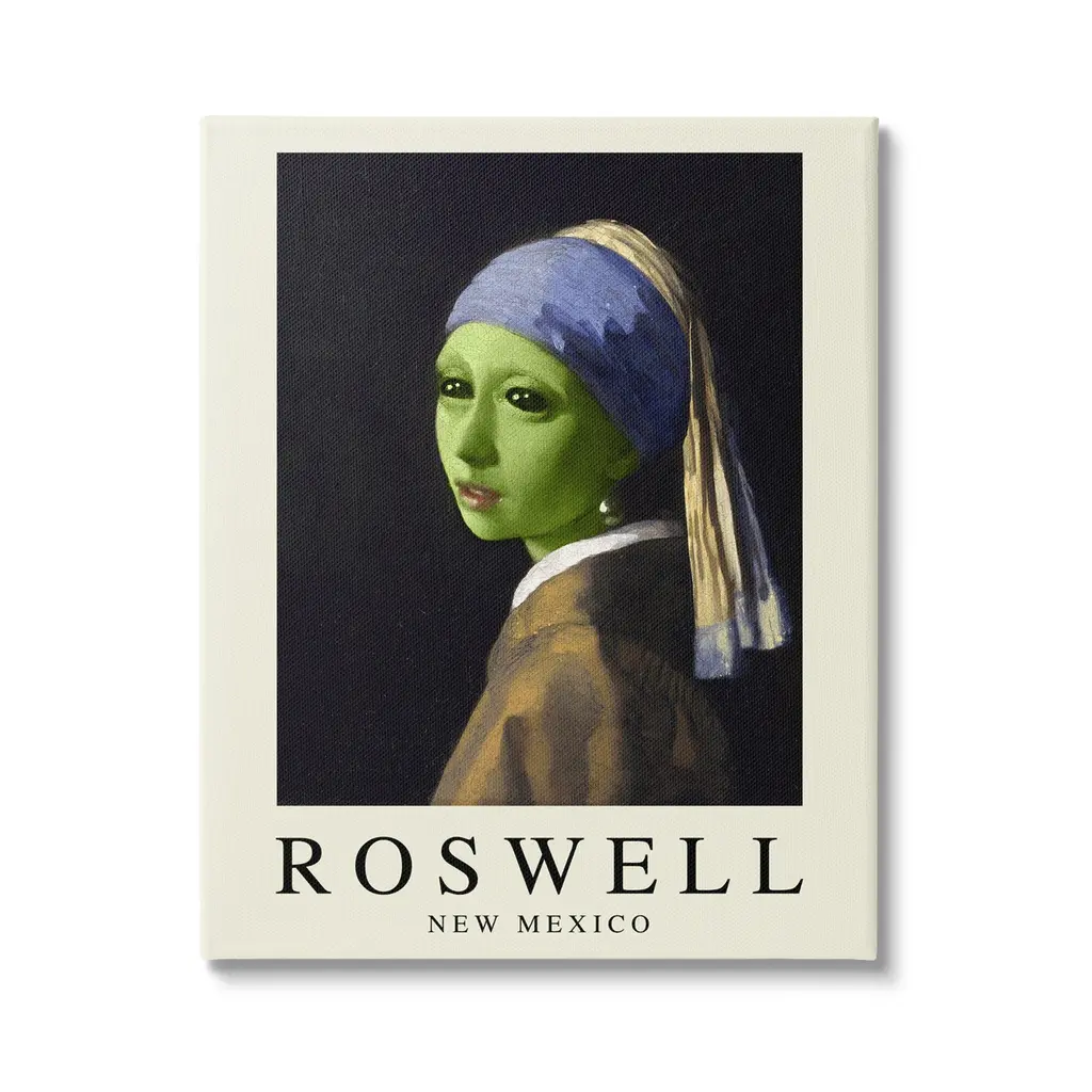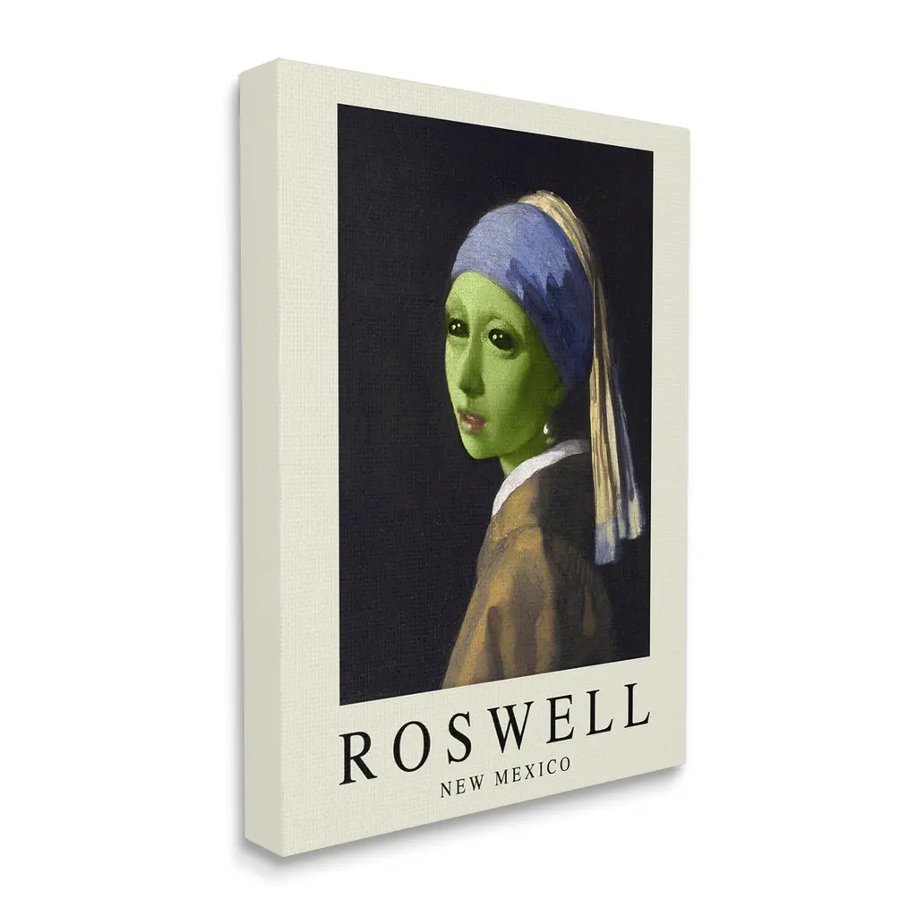 We create our stretched canvas to the highest standards. Using only the highest quality inks and canvas on Mimaki printers, we hand-cut and stretch each piece over a 1.5-inch thick wooden frame for hanging. As a result, the art comes ready to hang on the sturdy ledge with no installation required. Stupell Wall Art is made in the USA.Features: Dimensions: 16 x 1.5 x 20 InchesStretched Canvas Sizes Include Standard: 16 x 1.5 x 20 Large: 20 x 1.5 x 30 X-Large: 30 x 1.5 x 40 Oversized: 36 x 1.5 x 48Wall Art is Ready to Hang - No Installation or Hardware Needed. For Easy Set Up Lean or Layer Artwork on Shelf or Against Wall.Our stretched canvas is created with the highest standards. We use only the highest quality inks and canvas on our in house Mimaki printers, and then hand cut and stretch each piece over a 1.5 inch thick wooden frame for hanging. Made In USA.Artwork Relates To: Girl With A Pearl Earring, Classic, Alien, Funny, Roswell New MexicoDesign by Lil' Rue