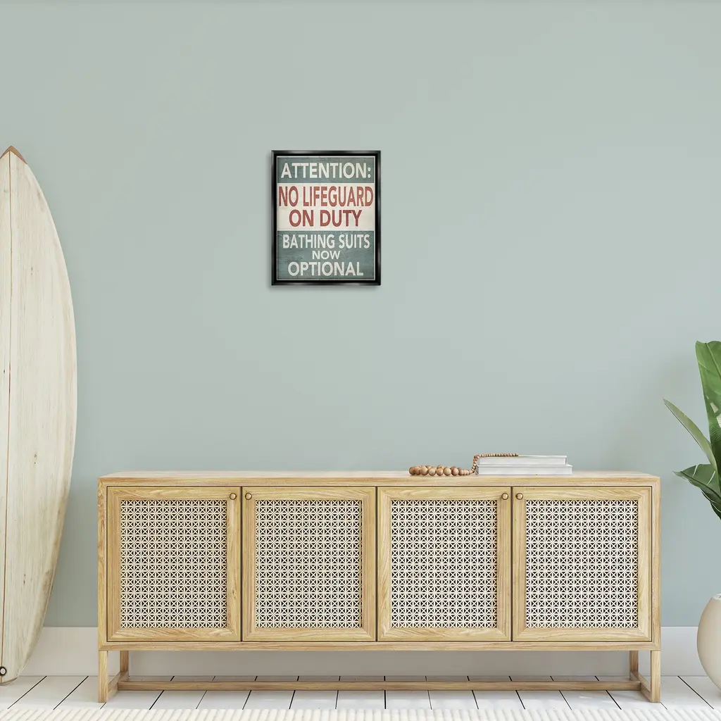 Elevate your home or office to the next level with Stupell Framed Floating Canvas Wall Art. Our premium hand-stretched canvas is mounted securely into a sturdy lightweight frame. The museum-style gap between the wrapped canvas and the box frame gives the illusion of floating artwork. Stupell Wall Art is made in the USA.Features: Dimensions: 17 x 1.7 x 21 Frame, 16 x 1.5 x 20 Canvas ArtFloating Frame Canvas Products are available in sizes 17"x21" and 25"x31". All Floating Frame Canvas Products have a 1.7" Depth.Wall Art is Ready to Hang with Hardware Free Hanging. No Installation required. For Easy Set Up Lean or Layer Artwork on Shelf or Against Wall. Artwork is Permently Fixed into the Frame.Our elevated 1.7" Thick Floating Frame is the perfect complement to our canvas style Wall Art. We use only the highest quality inks in house with industry leading printing solutions. Canvas is hand stretched over a durable wood foundation and then mounted securly into a Modern Box Frame. Made in the USA.Artwork Relates To: Phrase, Humor, Nautical, Beach, Rustic, Vintage, Lake, Attention, No Lifeguard on Duty Bathing Suits Now OptionalDesign by GraffiTee Studios