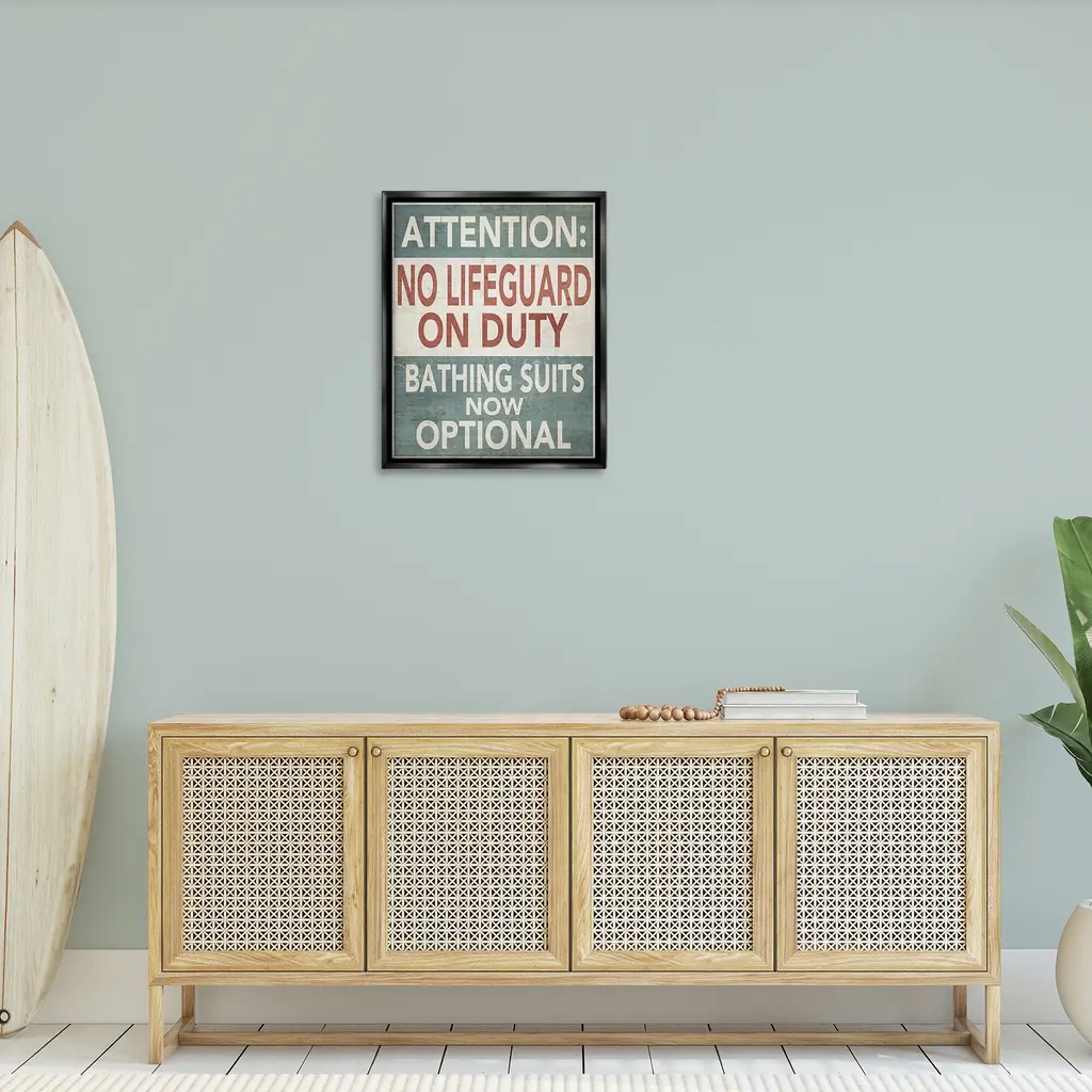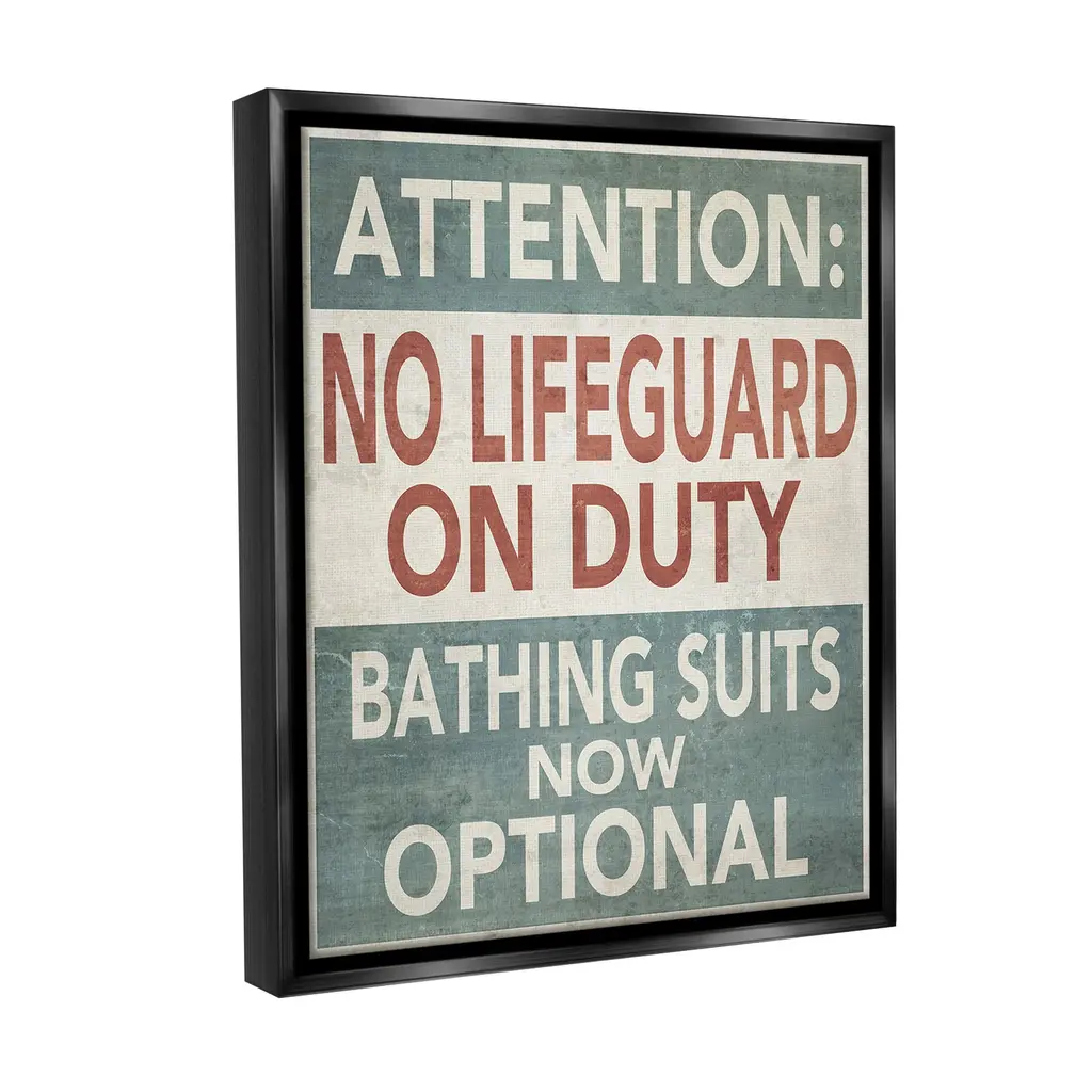 Elevate your home or office to the next level with Stupell Framed Floating Canvas Wall Art. Our premium hand-stretched canvas is mounted securely into a sturdy lightweight frame. The museum-style gap between the wrapped canvas and the box frame gives the illusion of floating artwork. Stupell Wall Art is made in the USA.Features: Dimensions: 17 x 1.7 x 21 Frame, 16 x 1.5 x 20 Canvas ArtFloating Frame Canvas Products are available in sizes 17"x21" and 25"x31". All Floating Frame Canvas Products have a 1.7" Depth.Wall Art is Ready to Hang with Hardware Free Hanging. No Installation required. For Easy Set Up Lean or Layer Artwork on Shelf or Against Wall. Artwork is Permently Fixed into the Frame.Our elevated 1.7" Thick Floating Frame is the perfect complement to our canvas style Wall Art. We use only the highest quality inks in house with industry leading printing solutions. Canvas is hand stretched over a durable wood foundation and then mounted securly into a Modern Box Frame. Made in the USA.Artwork Relates To: Phrase, Humor, Nautical, Beach, Rustic, Vintage, Lake, Attention, No Lifeguard on Duty Bathing Suits Now OptionalDesign by GraffiTee Studios