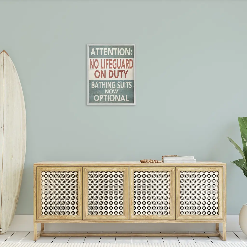 Add dimension to any room with our textured Framed Giclee Artwork. Our framed artwork is securely mounted into a 1.5-inch thick wood grain frame and ready to hang. Frames are available in three alluring styles: black, gray farmhouse and white. In addition, you should check out our oversized options if you want a statement piece. Stupell Wall Art is made in the USA.Features: Dimensions: 11 x 1.5 x 14 FramedFramed Giclee Products are available in the sizes 11"x14", 16"x20" or 24"x30". All Framed Giclee Products have a 1.5" Depth. Wall Art is Ready to Hang with Hardware Free Hanging. No installation required. For Easy Set Up Lean or Layer Artwork on Shelf or Against Wall.Our giclée prints are carefully mounted on a durable MDF backing, and then perfectly finished in a 1.5 inch thick woodgrain frame. Mounted frame colors include black, gray farmhouse and white. Made In USA.Artwork Relates To: Phrase, Humor, Nautical, Beach, Rustic, Vintage, Lake, Attention, No Lifeguard on Duty Bathing Suits Now OptionalDesign by GraffiTee Studios