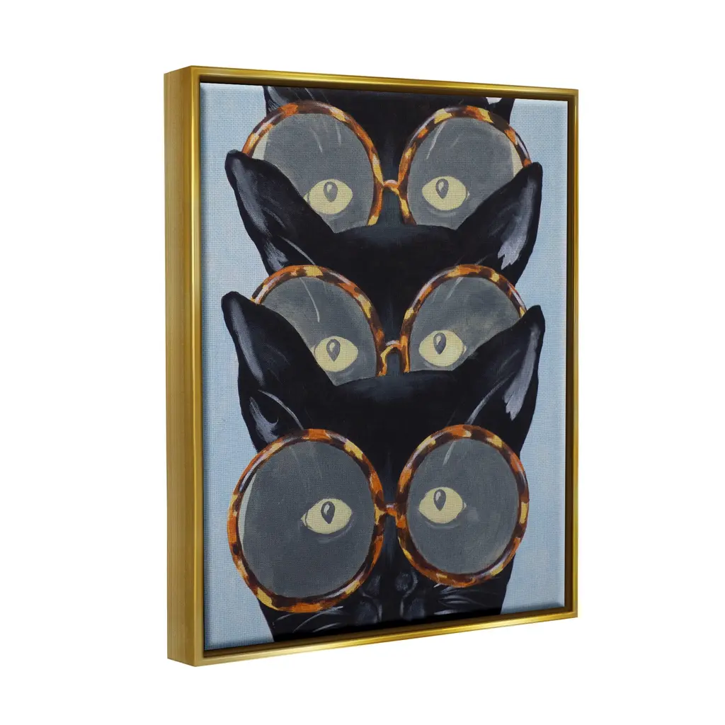 Elevate your home or office to the next level with Stupell Framed Floating Canvas Wall Art. Our premium hand-stretched canvas is mounted securely into a sturdy lightweight frame. The museum-style gap between the wrapped canvas and the box frame gives the illusion of floating artwork. Stupell Wall Art is made in the USA.Features: Dimensions: 17 x 1.7 x 21 Frame, 16 x 1.5 x 20 Canvas ArtFloating Frame Sizes Include Standard: 17 x 1.7 x 21 Oversized: 25 x 1.7 x 31Wall Art is Ready to Hang - No Installation or Hardware Needed. For Easy Set Up Lean or Layer Artwork on Shelf or Against Wall.Our elevated 1.7" Thick Floating Frame is the perfect complement to our canvas style Wall Art. We use only the highest quality inks in house with industry leading printing solutions. Canvas is hand stretched over a durable wood foundation and then mounted securly into a Modern Box Frame. Made in the USA.Artwork Relates To: Animal, Cat, Mammal, Pet, Black Cat, GlassesDesign by Coco de Paris