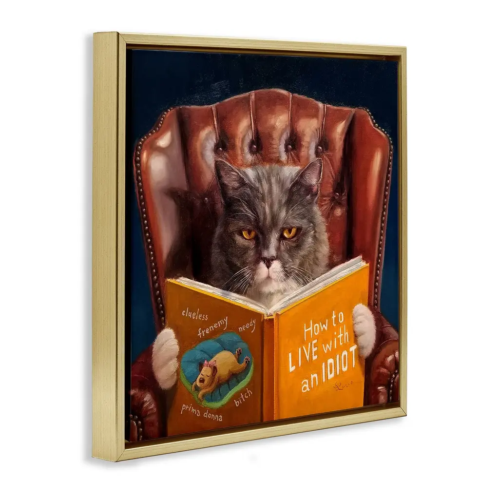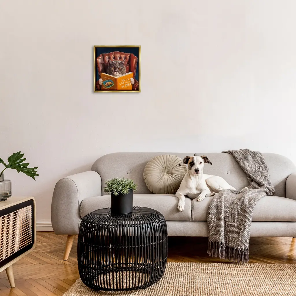 Elevate your home or office to the next level with Stupell Framed Floating Canvas Wall Art. Our premium hand-stretched canvas is mounted securely into a sturdy lightweight frame. The museum-style gap between the wrapped canvas and the box frame gives the illusion of floating artwork. Stupell Wall Art is made in the USA.Features: Dimensions: 18 x 1.7 x 18 Frame, 17 x 1.5 x 17 Canvas ArtFloating Frame Canvas Products are available in sizes 18"x18" and 25"x25". All Floating Frame Canvas Products have a 1.7" Depth.Wall Art is Ready to Hang with Hardware Free Hanging. No Installation required. For Easy Set Up Lean or Layer Artwork on Shelf or Against Wall. Artwork is Permently Fixed into the Frame.Our elevated 1.7" Thick Floating Frame is the perfect complement to our canvas style Wall Art. We use only the highest quality inks in house with industry leading printing solutions. Canvas is hand stretched over a durable wood foundation and then mounted securly into a Modern Box Frame. Made in the USA.Artwork Relates To: Animal, Cat, Humor, Reading, Book, ChairDesign by Lucia Heffernan