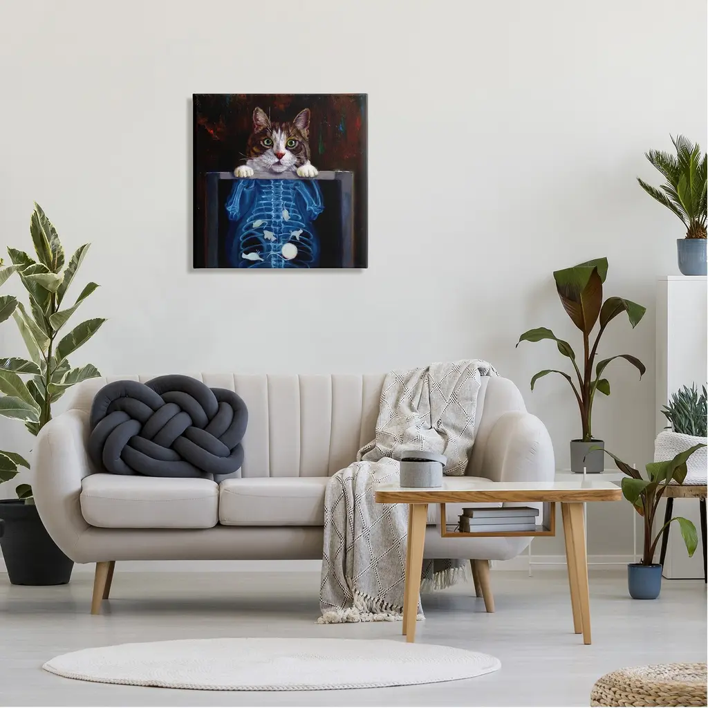 We create our stretched canvas to the highest standards. Using only the highest quality inks and canvas on Mimaki printers, we hand-cut and stretch each piece over a 1.5-inch thick wooden frame for hanging. As a result, the art comes ready to hang on the sturdy ledge with no installation required. Stupell Wall Art is made in the USA.Features: Dimensions: 17 x 1.5 x 17 InchesStretched Canvas Sizes Include Standard: 17 x 1.5 x 17 Large: 24 x 1.5 x 24 X-Large: 30 x 1.5 x 30 Oversized: 36 x 1.5 x 36Wall Art is Ready to Hang - No Installation or Hardware Needed. For Easy Set Up Lean or Layer Artwork on Shelf or Against Wall.Our stretched canvas is created with the highest standards. We use only the highest quality inks and canvas on our in house Mimaki printers, and then hand cut and stretch each piece over a 1.5 inch thick wooden frame for hanging. Made In USA.Artwork Relates To: Animal, Cat, Mammal, Pet, X-Ray, FunnyDesign by Lucia Heffernan