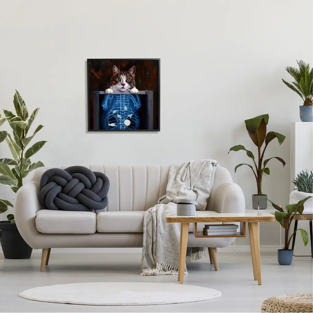 Add dimension to any room with our textured Framed Giclee Artwork. Our framed artwork is securely mounted into a 1.5-inch thick wood grain frame and ready to hang. Frames are available in three alluring styles: black, gray farmhouse and white. In addition, you should check out our oversized options if you want a statement piece. Stupell Wall Art is made in the USA.Features: Dimensions: 12 x 1.5 x 12 FramedFramed Giclee Sizes Include Standard: 12 x 1.5 x 12 Large: 17 x 1.5 x 17 Oversized: 24 x 1.5 x 24Wall Art is Ready to Hang - No Installation or Hardware Needed. For Easy Set Up Lean or Layer Artwork on Shelf or Against Wall.Our giclée prints are carefully mounted on a durable MDF backing, and then perfectly finished in a 1.5 inch thick woodgrain frame. Mounted frame colors include black, gray farmhouse and white. Made In USA.Artwork Relates To: Animal, Cat, Mammal, Pet, X-Ray, FunnyDesign by Lucia Heffernan