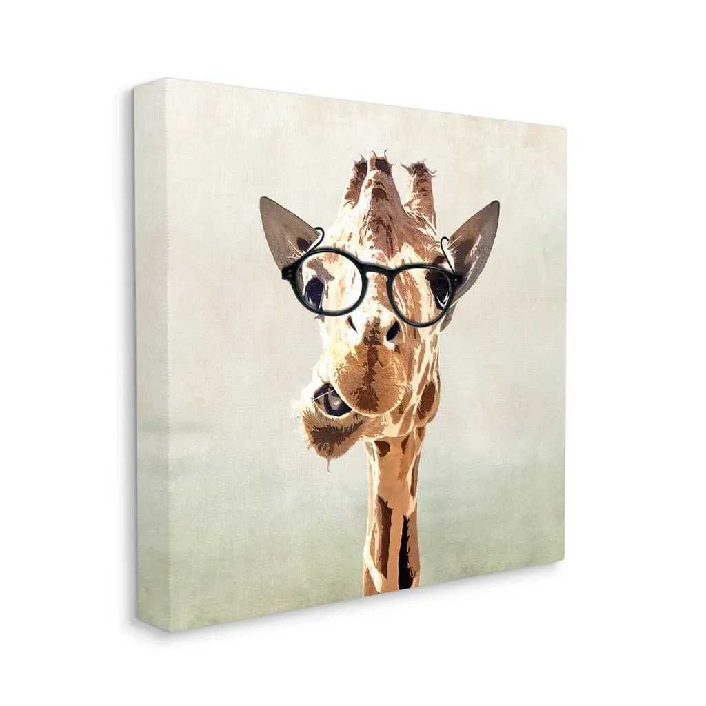 We create our stretched canvas to the highest standards. Using only the highest quality inks and canvas on Mimaki printers, we hand-cut and stretch each piece over a 1.5-inch thick wooden frame for hanging. As a result, the art comes ready to hang on the sturdy ledge with no installation required. Stupell Wall Art is made in the USA.Features: Dimensions: 17 x 1.5 x 17 InchesStretched Canvas Sizes Include Standard: 17 x 1.5 x 17 Large: 24 x 1.5 x 24 X-Large: 30 x 1.5 x 30 Oversized: 36 x 1.5 x 36Wall Art is Ready to Hang - No Installation or Hardware Needed. For Easy Set Up Lean or Layer Artwork on Shelf or Against Wall.Our stretched canvas is created with the highest standards. We use only the highest quality inks and canvas on our in house Mimaki printers, and then hand cut and stretch each piece over a 1.5 inch thick wooden frame for hanging. Made In USA.Artwork Relates To: Glasses, Animal, Giraffe, Mammal, WildlifeDesign by Karen Smith