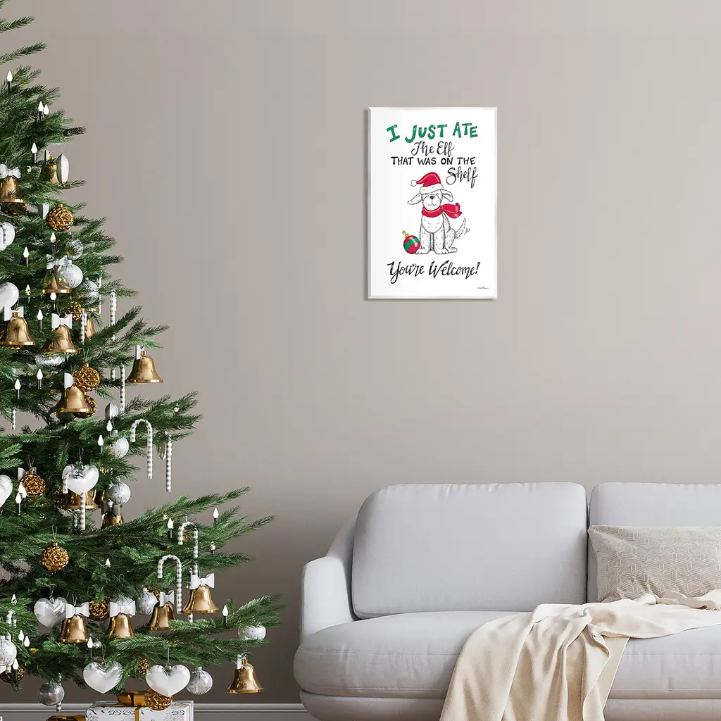 Our wall plaques start as high-quality lithograph prints mounted on durable 0.5-inch thick MDF wood. Each piece is hand finished and comes with a fresh layer of white foil on the sides to give it a crisp, clean look. Plaques arrive ready to hang without installation and come with removable plastic corners to keep them from damage in transit. Stupell Wall Art is made in the USA.Features: Dimensions: 10 x 0.5 x 15 InchesWall Plaque Sizes Include Standard: 10 x 0.5 x 15 Oversized: 13 x 0.5 x 19Wall Art is Ready to Hang with Hardware Free Hanging. No installation required. For Easy Set Up Lean or Layer Artwork on Shelf or Against Wall.All of our wall plaques start off as high quality lithograph prints that are then mounted on durable 0.5 inch thick MDF wood. Each piece is hand finished and comes with a fresh layer of foil on the sides to give it a crisp clean look. Made In USA.Artwork Relates To: Animal, Mammal, Pet, Christmas, Holiday, Seasonal, Funny, Humor, Dog, I Just Ate the Elf That was on the Shelf You're WelcomeDesign by Deb Strain