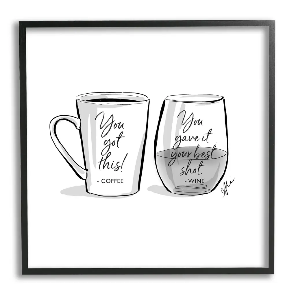 Our Framed Giclee Wall Art adds a touch of class to any space in your home or office. Frames are available in three alluring styles: black, gray farmhouse and white. Our textured artwork will add more depth and dimension to any space. Each piece is mounted with a 1.5 inch thick wood grain frame that is ready to hang! Looking for a statement piece? We have oversized artwork available.Features:Dimensions: 12 x 1.5 x 12 FramedFramed Giclee Sizes IncludeStandard: 12 x 1.5 x 12Large: 17 x 1.5 x 17Oversized: 24 x 1.5 x 24Wall Art is Ready to Hang - No Installation or Hardware Needed. For Easy Set Up Lean or Layer Artwork on Shelf or Against Wall.Our giclee prints are carefully mounted on a durable MDF backing, and then perfectly finished in a 1.5 inch thick woodgrain frame. Mounted frame colors include black, gray farmhouse and white. Made In USA.Artwork Relates To: Glass; Mug; Beverage; Coffee, Wine, Phrase, Humor, FunnyDesign by Alison Petrie