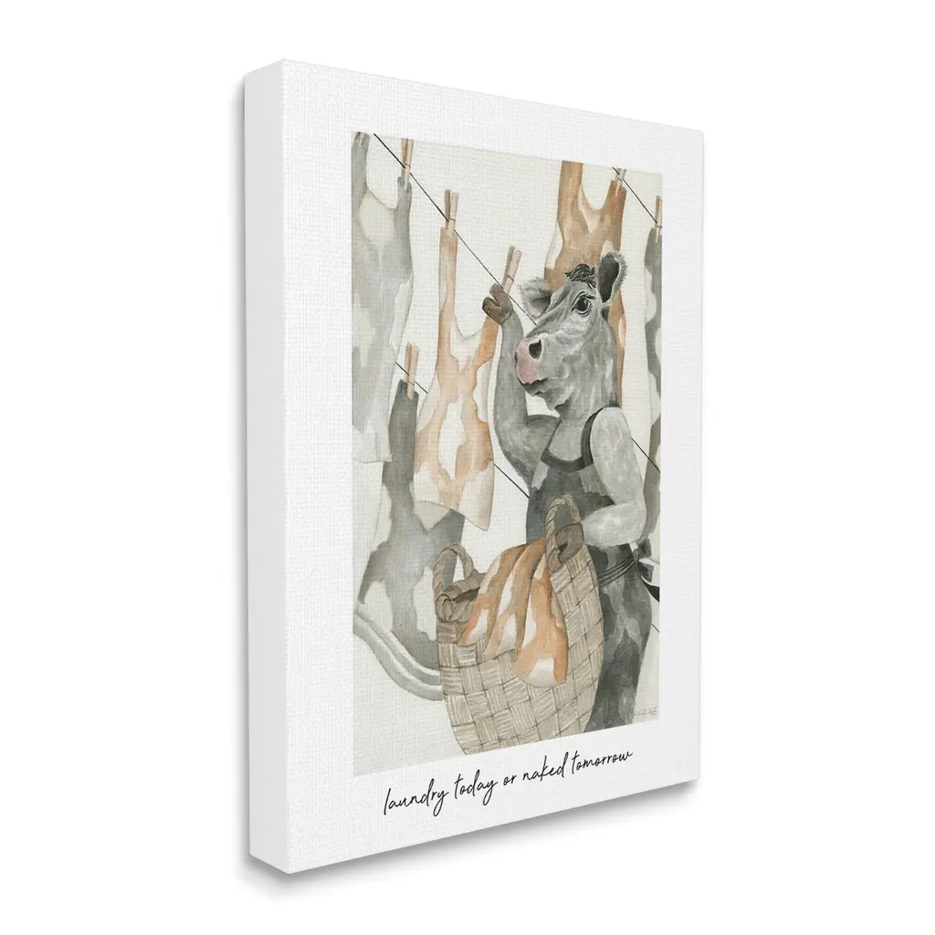 We create our stretched canvas to the highest standards. Using only the highest quality inks and canvas on Mimaki printers, we hand-cut and stretch each piece over a 1.5-inch thick wooden frame for hanging. As a result, the art comes ready to hang on the sturdy ledge with no installation required. Stupell Wall Art is made in the USA.Features: Dimensions: 16 x 1.5 x 20 InchesStretched Canvas Sizes Include Standard: 16 x 1.5 x 20 Large: 20 x 1.5 x 30 X-Large: 30 x 1.5 x 40 Oversized: 36 x 1.5 x 48Wall Art is Ready to Hang with Hardware Free Hanging. No installation required. For Easy Set Up Lean or Layer Artwork on Shelf or Against Wall.Our stretched canvas is created with the highest standards. We use only the highest quality inks and canvas on our in house Mimaki printers, and then hand cut and stretch each piece over a 1.5 inch thick wooden frame for hanging. Made In USA.Artwork Relates To: Clothing, Animal, Cow, Cattle, Laundry, Laundry Today or Naked TomorrowDesign by Cindy Jacobs