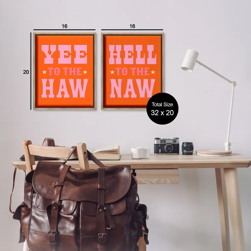 Elevate your home or office to the next level with Stupell Framed Floating Canvas Wall Art. Our premium hand-stretched canvas is mounted securely into a sturdy lightweight frame. The museum-style gap between the wrapped canvas and the box frame gives the illusion of floating artwork. Stupell Wall Art is made in the USA.Features: Dimensions: 2 Piece Set, Each Frame is 17 x 1.7 x 21Two Piece Floater Framed Canvas are available as 17x21 or 25x31 Panels. All Floater Frame Products have a 1.7" Depth.Wall Art is Ready to Hang with Hardware Free Hanging. No Installation required. For Easy Set Up Lean or Layer Artwork on Shelf or Against Wall. Artwork is Permently Fixed into the Frame.Our elevated 1.7" Thick Floating Frame is the perfect complement to our canvas style Wall Art. We use only the highest quality inks in house with industry leading printing solutions. Canvas is hand stretched over a durable wood foundation and then mounted securly into a Modern Box Frame. Made in the USA.Artwork Relates To: Phrase, Cowgirl, Cowboy, Southwestern, Southern, Country, Typography, Yee to the Haw, Hell to the NawDesign by Victoria Barnes