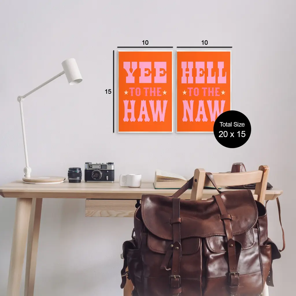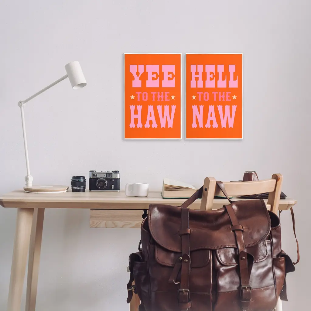 Fill any space with Stupell Wall Art Sets. Our wall plaques start as high-quality lithograph prints mounted on durable 0.5-inch thick MDF wood. Each piece is hand finished and comes with a fresh layer of white foil on the sides to give it a crisp, clean look. Plaques arrive ready to hang without installation and come with removable plastic corners to keep them from damage in transit. Stupell Wall Art is made in the USA.Features: Dimensions: 2 Piece Set, Each Panel is 10 x 0.5 x 15 InchesTwo Piece Wall Plaque Sets are available as 10"x15" or 13"x19" Panels. All Wall Art Plaques have a 0.5" Depth.Wall Art is Ready to Hang with Hardware Free Hanging. No installation required. For Easy Set Up Lean or Layer Artwork on Shelf or Against Wall.All of our wall plaques start off as high quality lithograph prints that are then mounted on durable 0.5 inch thick MDF wood. Each piece is hand finished and comes with a fresh layer of foil on the sides to give it a crisp clean look. Made In USA.Artwork Relates To: Phrase, Cowgirl, Cowboy, Southwestern, Southern, Country, Typography, Yee to the Haw, Hell to the NawDesign by Victoria Barnes