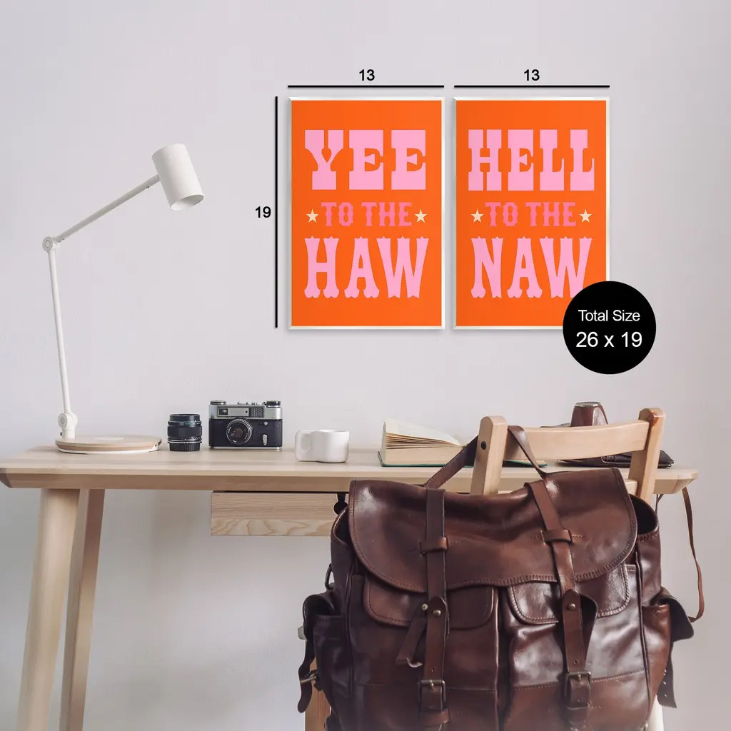 Fill any space with Stupell Wall Art Sets. Our wall plaques start as high-quality lithograph prints mounted on durable 0.5-inch thick MDF wood. Each piece is hand finished and comes with a fresh layer of white foil on the sides to give it a crisp, clean look. Plaques arrive ready to hang without installation and come with removable plastic corners to keep them from damage in transit. Stupell Wall Art is made in the USA.Features: Dimensions: 2 Piece Set, Each Panel is 10 x 0.5 x 15 InchesTwo Piece Wall Plaque Sets are available as 10"x15" or 13"x19" Panels. All Wall Art Plaques have a 0.5" Depth.Wall Art is Ready to Hang with Hardware Free Hanging. No installation required. For Easy Set Up Lean or Layer Artwork on Shelf or Against Wall.All of our wall plaques start off as high quality lithograph prints that are then mounted on durable 0.5 inch thick MDF wood. Each piece is hand finished and comes with a fresh layer of foil on the sides to give it a crisp clean look. Made In USA.Artwork Relates To: Phrase, Cowgirl, Cowboy, Southwestern, Southern, Country, Typography, Yee to the Haw, Hell to the NawDesign by Victoria Barnes