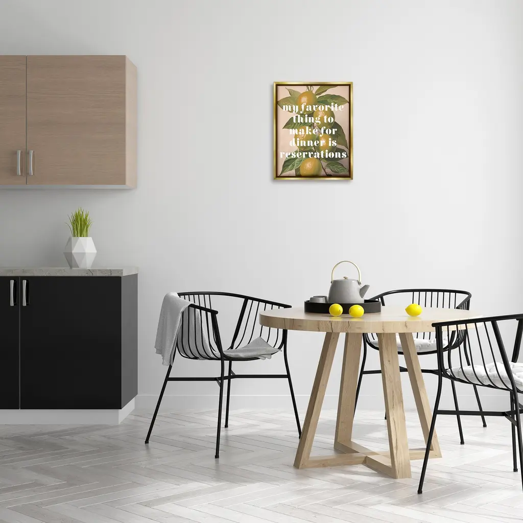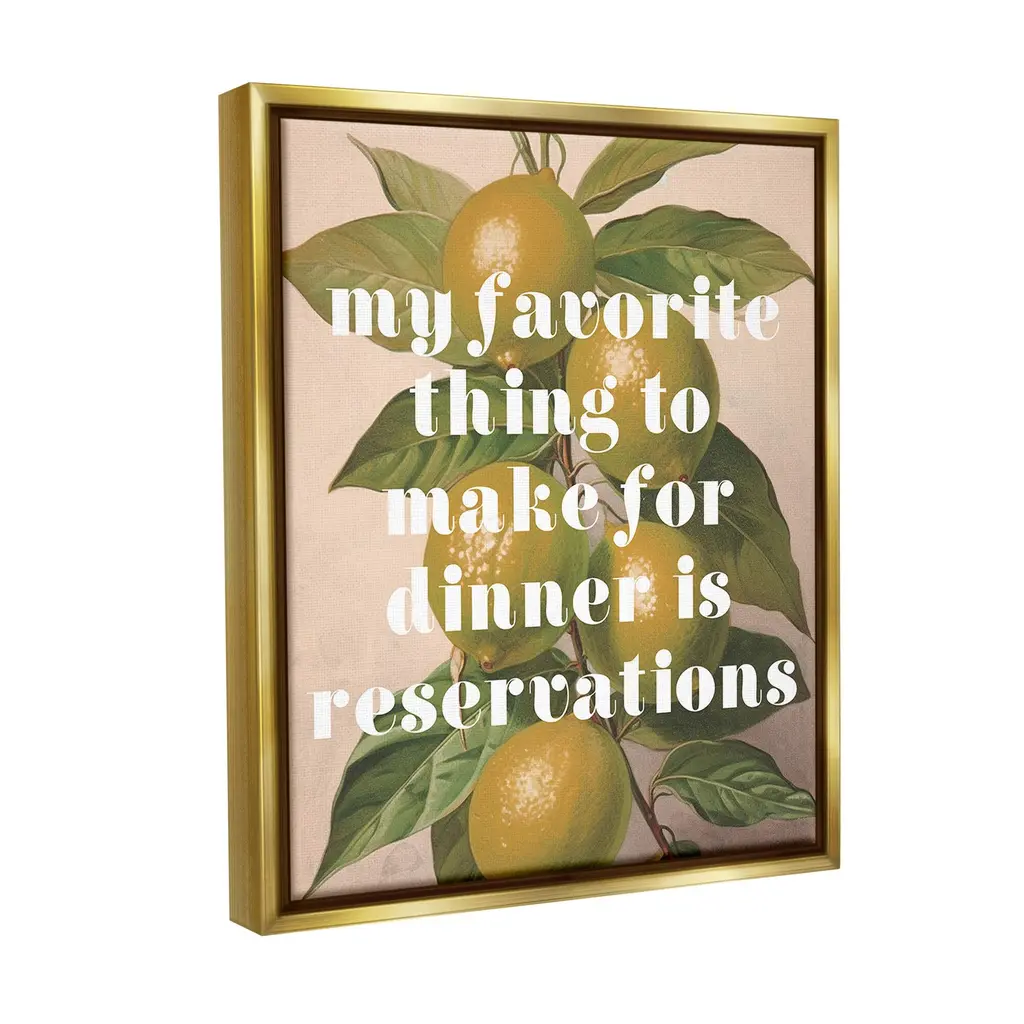 Elevate your home or office to the next level with Stupell Framed Floating Canvas Wall Art. Our premium hand-stretched canvas is mounted securely into a sturdy lightweight frame. The museum-style gap between the wrapped canvas and the box frame gives the illusion of floating artwork. Stupell Wall Art is made in the USA.Features: Dimensions: 17 x 1.7 x 21 Frame, 16 x 1.5 x 20 Canvas ArtFloating Frame Canvas Products are available in sizes 17"x21" and 25"x31". All Floating Frame Canvas Products have a 1.7" Depth.Wall Art is Ready to Hang with Hardware Free Hanging. No Installation required. For Easy Set Up Lean or Layer Artwork on Shelf or Against Wall. Artwork is Permently Fixed into the Frame.Our elevated 1.7" Thick Floating Frame is the perfect complement to our canvas style Wall Art. We use only the highest quality inks in house with industry leading printing solutions. Canvas is hand stretched over a durable wood foundation and then mounted securly into a Modern Box Frame. Made in the USA.Artwork Relates To: Citrus Fruit, Food, Fruit, Plant, Produce, Lemon, Humor, Funny, My Favorite Thing to Make for Dinner is ReservationsDesign by Lil' Rue
