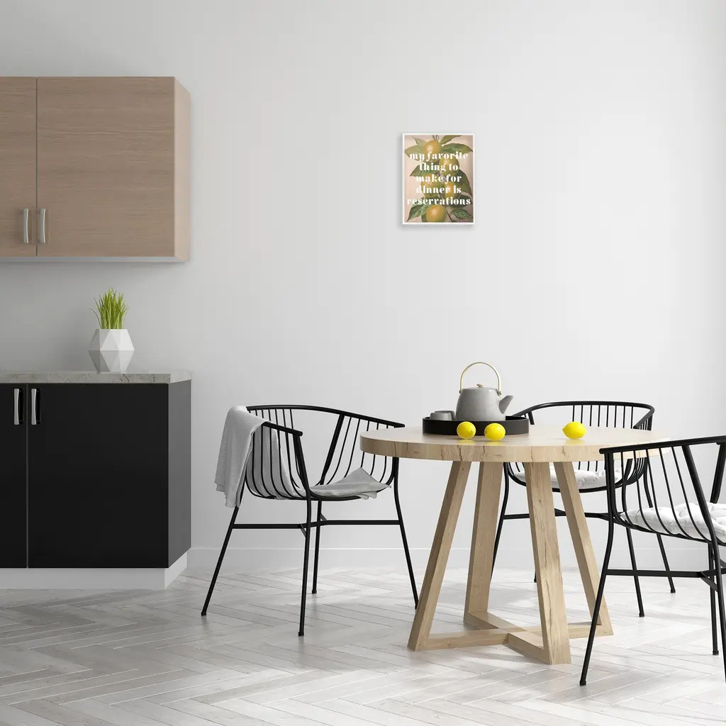 Add dimension to any room with our textured Framed Giclee Artwork. Our framed artwork is securely mounted into a 1.5-inch thick wood grain frame and ready to hang. Frames are available in three alluring styles: black, gray farmhouse and white. In addition, you should check out our oversized options if you want a statement piece. Stupell Wall Art is made in the USA.Features: Dimensions: 11 x 1.5 x 14 FramedFramed Giclee Products are available in the sizes 11"x14", 16"x20" or 24"x30". All Framed Giclee Products have a 1.5" Depth. Wall Art is Ready to Hang with Hardware Free Hanging. No installation required. For Easy Set Up Lean or Layer Artwork on Shelf or Against Wall.Our giclée prints are carefully mounted on a durable MDF backing, and then perfectly finished in a 1.5 inch thick woodgrain frame. Mounted frame colors include black, gray farmhouse and white. Made In USA.Artwork Relates To: Citrus Fruit, Food, Fruit, Plant, Produce, Lemon, Humor, Funny, My Favorite Thing to Make for Dinner is ReservationsDesign by Lil' Rue