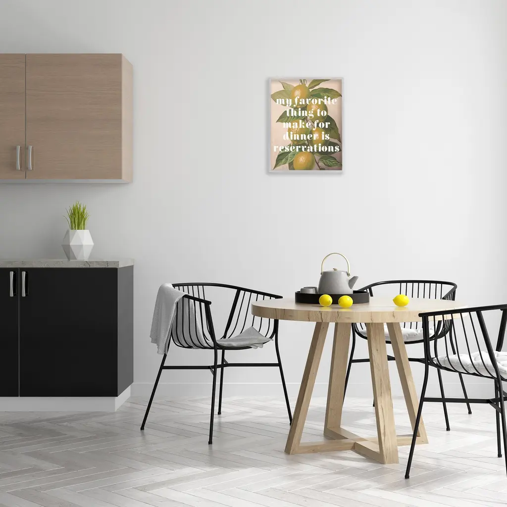 Add dimension to any room with our textured Framed Giclee Artwork. Our framed artwork is securely mounted into a 1.5-inch thick wood grain frame and ready to hang. Frames are available in three alluring styles: black, gray farmhouse and white. In addition, you should check out our oversized options if you want a statement piece. Stupell Wall Art is made in the USA.Features: Dimensions: 11 x 1.5 x 14 FramedFramed Giclee Products are available in the sizes 11"x14", 16"x20" or 24"x30". All Framed Giclee Products have a 1.5" Depth. Wall Art is Ready to Hang with Hardware Free Hanging. No installation required. For Easy Set Up Lean or Layer Artwork on Shelf or Against Wall.Our giclée prints are carefully mounted on a durable MDF backing, and then perfectly finished in a 1.5 inch thick woodgrain frame. Mounted frame colors include black, gray farmhouse and white. Made In USA.Artwork Relates To: Citrus Fruit, Food, Fruit, Plant, Produce, Lemon, Humor, Funny, My Favorite Thing to Make for Dinner is ReservationsDesign by Lil' Rue