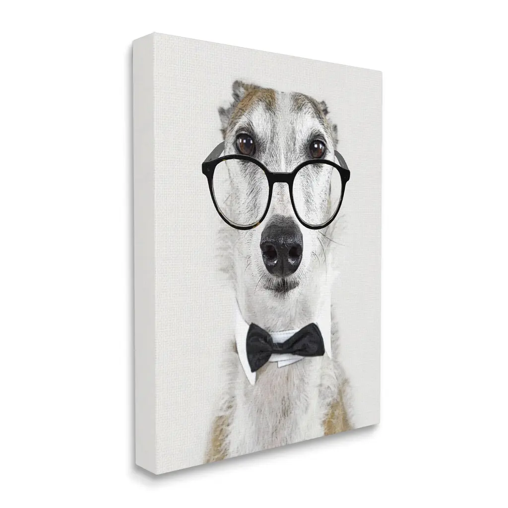Proudly made in the USA, Our stretched canvas is created with the highest standards. We use only the highest quality inks and canvas on our in house Mimaki printers, and then hand cut and stretch each piece over a 1.5 inch thick wooden frame for hanging. The art comes ready to hang with no installation required. Room Type: Living Room, Den, Hallway, Office, Entryway, Study, Dining Room or Bedroom, Guest Room, Studio, Dorm or BoudoirFeatures: Dimensions: 16 x 1.5 x 20 InchesStretched Canvas Sizes Include Standard: 16 x 1.5 x 20 Large: 20 x 1.5 x 30 X-Large: 30 x 1.5 x 40 Oversized: 36 x 1.5 x 48Wall Art is Ready to Hang - No Installation or Hardware Needed. For Easy Set Up Lean or Layer Artwork on Shelf or Against Wall.Our stretched canvas is created with the highest standards. We use only the highest quality inks and canvas on our in house Mimaki printers, and then hand cut and stretch each piece over a 1.5 inch thick wooden frame for hanging. Made In USA.Artwork Relates To: Glasses, Formal Wear, Tie, Animal, Canine, Dog, Mammal, Pet, Bow Tie, Portrait, PuppyDesign by Karen Smith