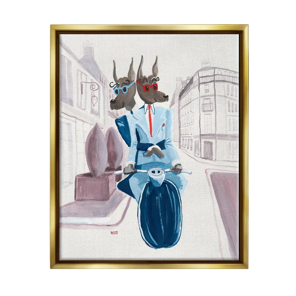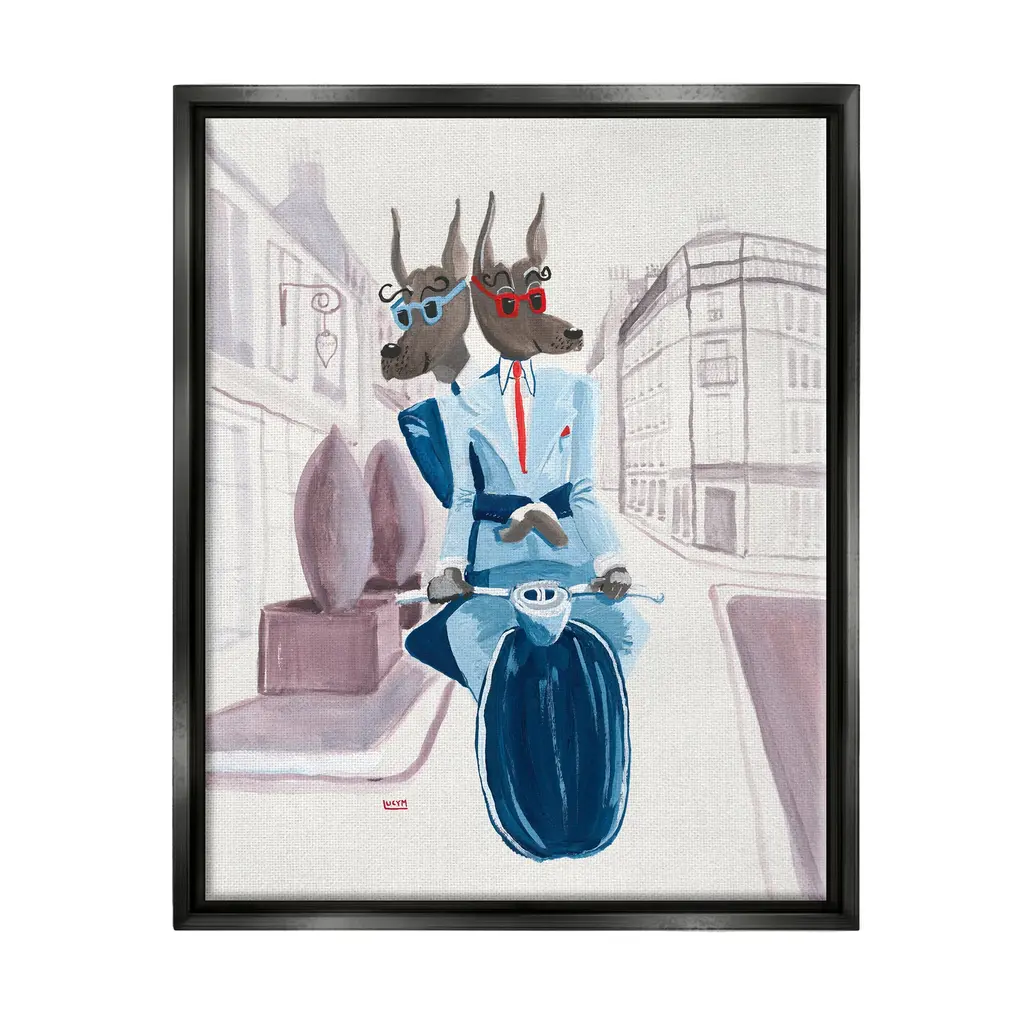 Elevate your home or office to the next level with Stupell Framed Floating Canvas Wall Art. Our premium hand-stretched canvas is mounted securely into a sturdy lightweight frame. The museum-style gap between the wrapped canvas and the box frame gives the illusion of floating artwork. Stupell Wall Art is made in the USA.Features: Dimensions: 17 x 1.7 x 21 Frame, 16 x 1.5 x 20 Canvas ArtFloating Frame Sizes Include Standard: 17 x 1.7 x 21 Oversized: 25 x 1.7 x 31Wall Art is Ready to Hang - No Installation or Hardware Needed. For Easy Set Up Lean or Layer Artwork on Shelf or Against Wall.Our elevated 1.7" Thick Floating Frame is the perfect complement to our canvas style Wall Art. We use only the highest quality inks in house with industry leading printing solutions. Canvas is hand stretched over a durable wood foundation and then mounted securly into a Modern Box Frame. Made in the USA.Artwork Relates To: Drawing, Painting, Dog, Suits, Moped, Scooter, City, Buildings, UrbanDesign by Lucy Marshall