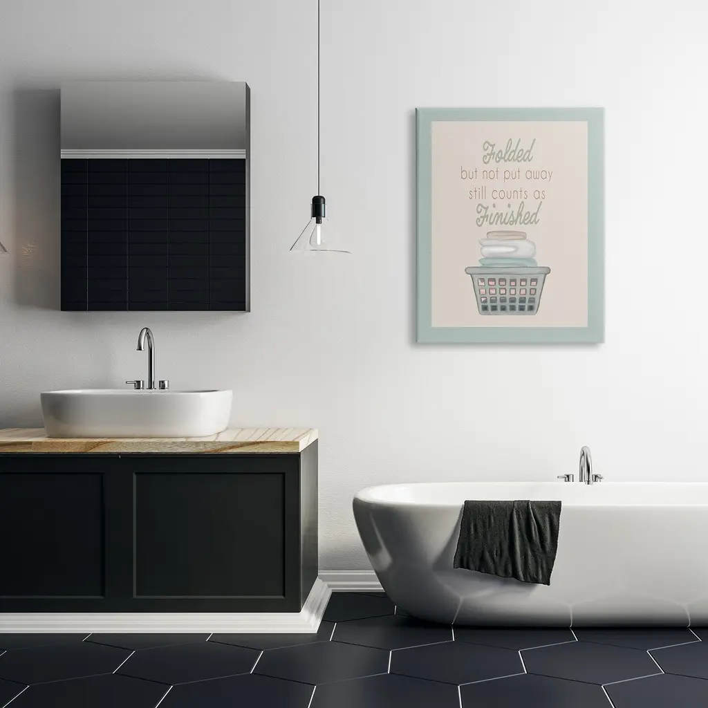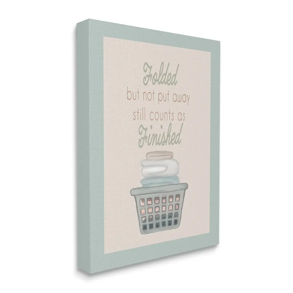 We create our stretched canvas to the highest standards. Using only the highest quality inks and canvas on Mimaki printers, we hand-cut and stretch each piece over a 1.5-inch thick wooden frame for hanging. As a result, the art comes ready to hang on the sturdy ledge with no installation required. Stupell Wall Art is made in the USA.Features: Dimensions: 16 x 1.5 x 20 InchesStretched Canvas Sizes Include Standard: 16 x 1.5 x 20 Large: 20 x 1.5 x 30 X-Large: 30 x 1.5 x 40 Oversized: 36 x 1.5 x 48Wall Art is Ready to Hang with Hardware Free Hanging. No installation required. For Easy Set Up Lean or Layer Artwork on Shelf or Against Wall.Our stretched canvas is created with the highest standards. We use only the highest quality inks and canvas on our in house Mimaki printers, and then hand cut and stretch each piece over a 1.5 inch thick wooden frame for hanging. Made In USA.Artwork Relates To: Phrase, Laundry, Funny, Folded But Not Put Away Still Counts as FinishedDesign by Elizabeth Medley
