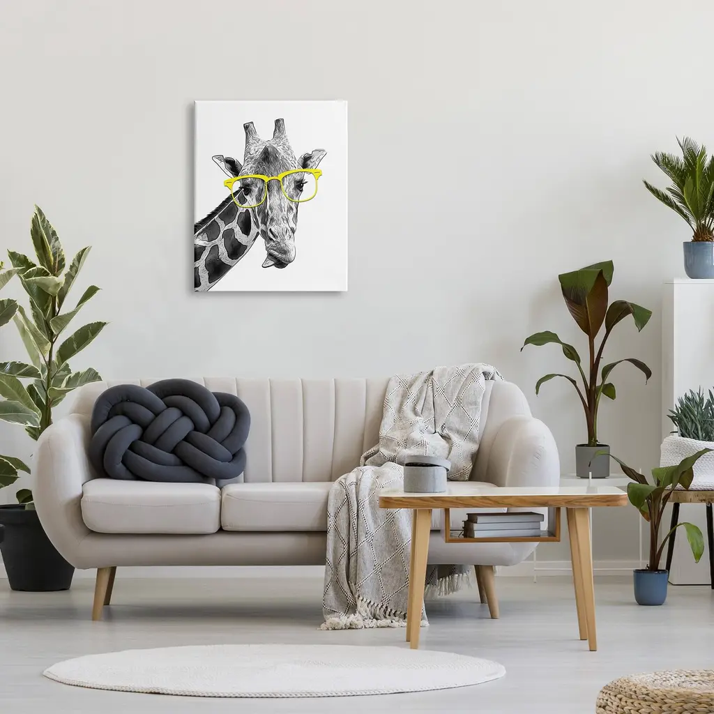 We create our stretched canvas to the highest standards. Using only the highest quality inks and canvas on Mimaki printers, we hand-cut and stretch each piece over a 1.5-inch thick wooden frame for hanging. As a result, the art comes ready to hang on the sturdy ledge with no installation required. Stupell Wall Art is made in the USA.Features: Dimensions: 16 x 1.5 x 20 InchesStretched Canvas Sizes Include Standard: 16 x 1.5 x 20 Large: 20 x 1.5 x 30 X-Large: 30 x 1.5 x 40 Oversized: 36 x 1.5 x 48Wall Art is Ready to Hang - No Installation or Hardware Needed. For Easy Set Up Lean or Layer Artwork on Shelf or Against Wall.Our stretched canvas is created with the highest standards. We use only the highest quality inks and canvas on our in house Mimaki printers, and then hand cut and stretch each piece over a 1.5 inch thick wooden frame for hanging. Made In USA.Artwork Relates To: Glasses, Animal, Mammal, Wildlife, GiraffeDesign by Annalisa Latella