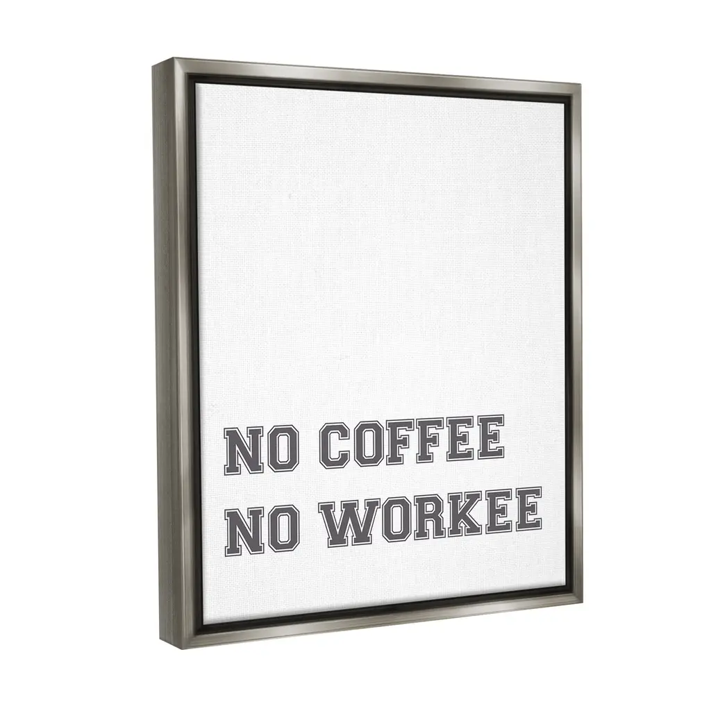 Elevate your home or office to the next level with Stupell Framed Floating Canvas Wall Art. Our premium hand-stretched canvas is mounted securely into a sturdy lightweight frame. The museum-style gap between the wrapped canvas and the box frame gives the illusion of floating artwork. Stupell Wall Art is made in the USA.Features: Dimensions: 17 x 1.7 x 21 Frame, 16 x 1.5 x 20 Canvas ArtFloating Frame Canvas Products are available in sizes 17"x21" and 25"x31". All Floating Frame Canvas Products have a 1.7" Depth.Wall Art is Ready to Hang with Hardware Free Hanging. No Installation required. For Easy Set Up Lean or Layer Artwork on Shelf or Against Wall. Artwork is Permently Fixed into the Frame.Our elevated 1.7" Thick Floating Frame is the perfect complement to our canvas style Wall Art. We use only the highest quality inks in house with industry leading printing solutions. Canvas is hand stretched over a durable wood foundation and then mounted securly into a Modern Box Frame. Made in the USA.Artwork Relates To: Phrase, Humor, Funny, Coffee, Morning, Work, No Coffee No WorkeeDesign by Lil' Rue
