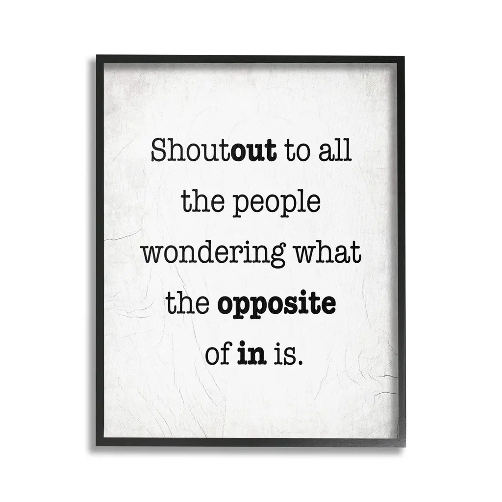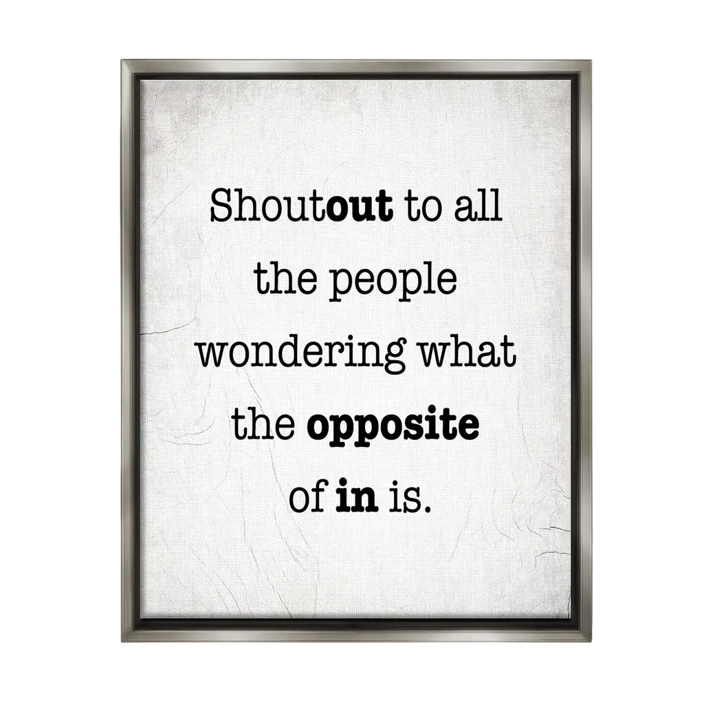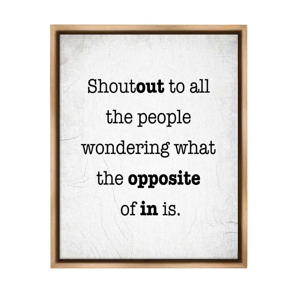 Elevate your home or office to the next level with Stupell Framed Floating Canvas Wall Art. Our premium hand-stretched canvas is mounted securely into a sturdy lightweight frame. The museum-style gap between the wrapped canvas and the box frame gives the illusion of floating artwork. Stupell Wall Art is made in the USA.Features: Dimensions: 17 x 1.7 x 21 Frame, 16 x 1.5 x 20 Canvas ArtFloating Frame Canvas Products are available in sizes 17"x21" and 25"x31". All Floating Frame Canvas Products have a 1.7" Depth.Wall Art is Ready to Hang with Hardware Free Hanging. No Installation required. For Easy Set Up Lean or Layer Artwork on Shelf or Against Wall. Artwork is Permently Fixed into the Frame.Our elevated 1.7" Thick Floating Frame is the perfect complement to our canvas style Wall Art. We use only the highest quality inks in house with industry leading printing solutions. Canvas is hand stretched over a durable wood foundation and then mounted securly into a Modern Box Frame. Made in the USA.Artwork Relates To: Phrase, Humor, Funny, Rustic, Sassy, Shoutout to all the People Wondering What the Opposite of In IsDesign by Lil' Rue