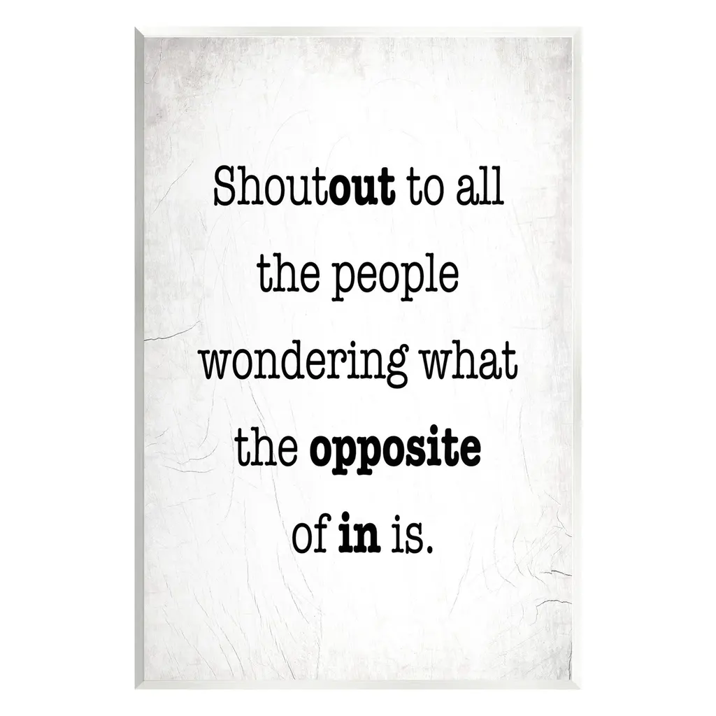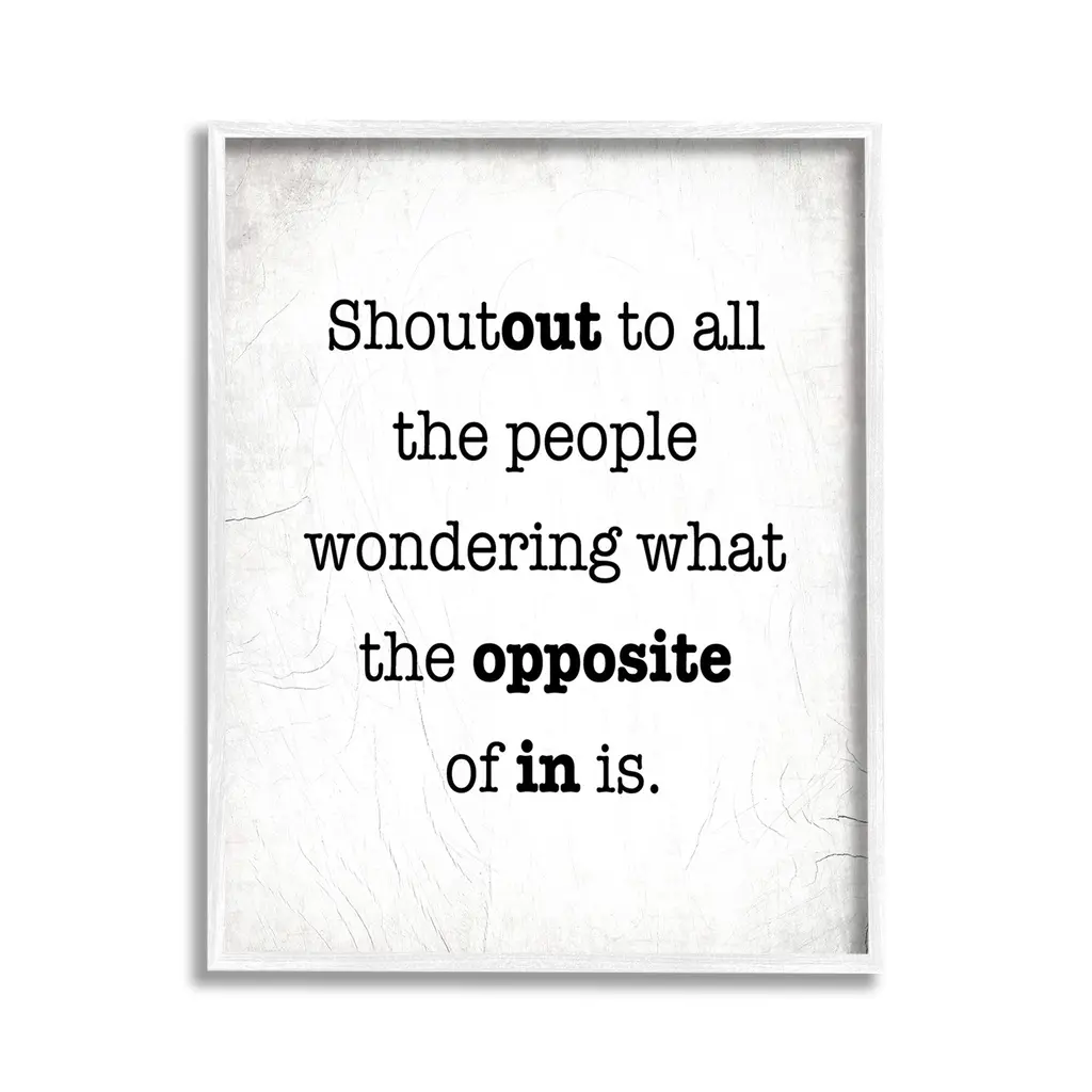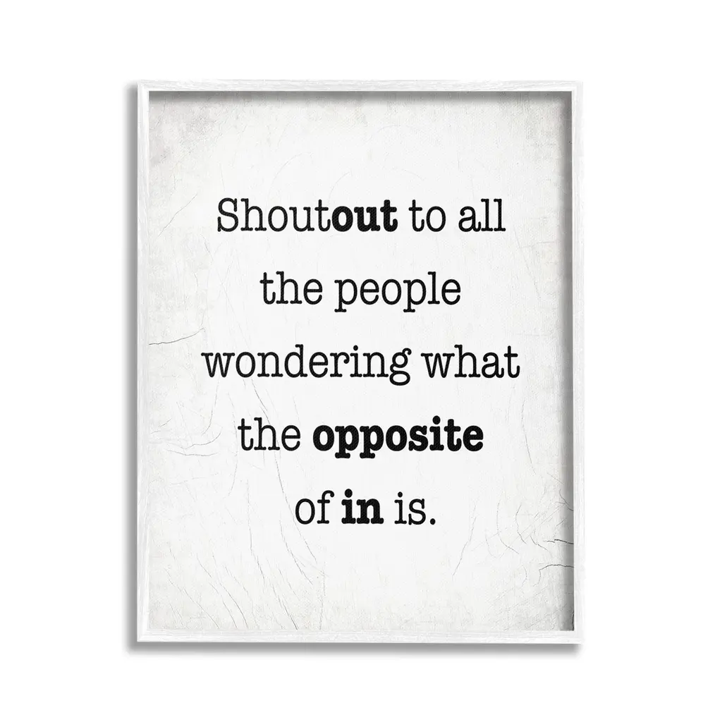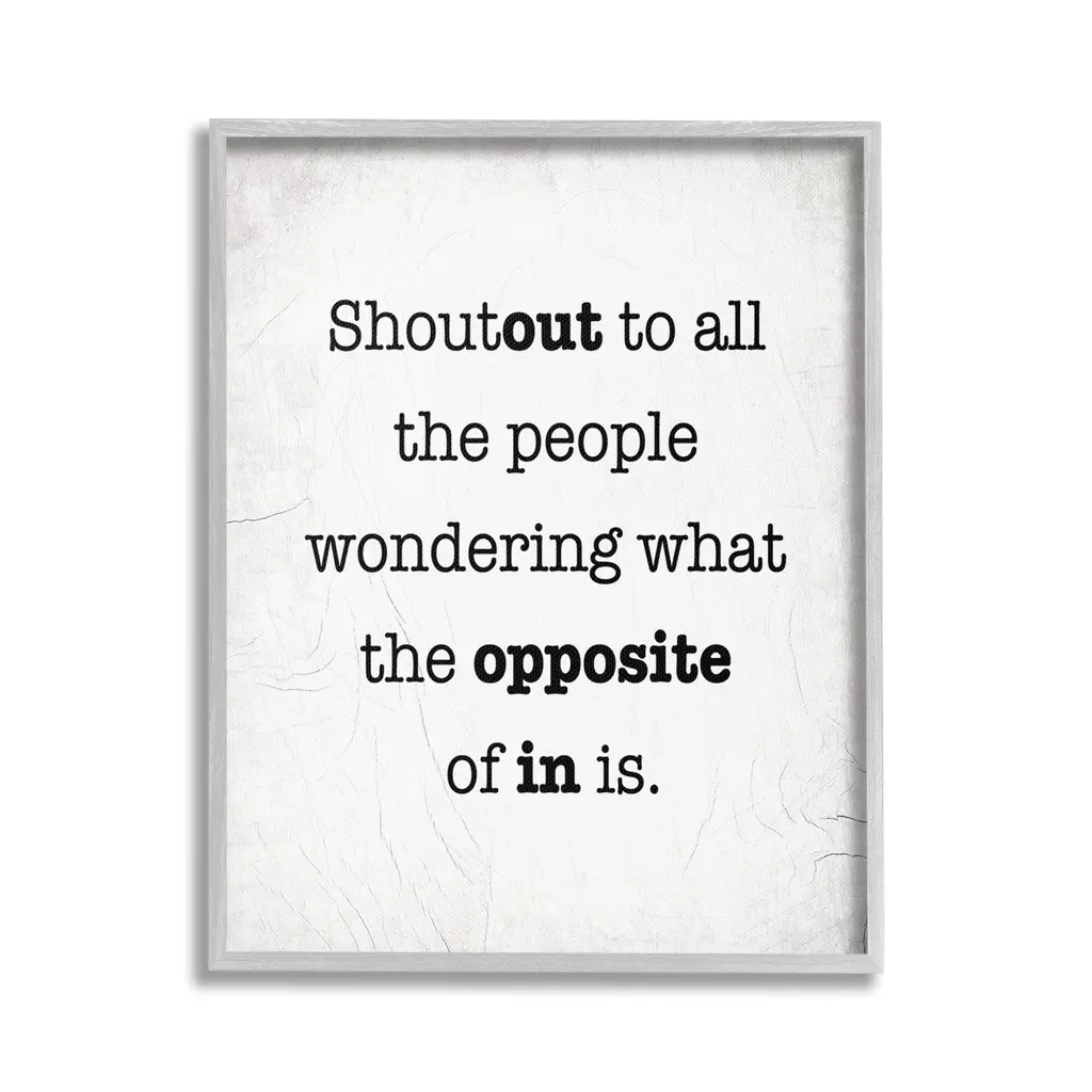 Elevate your home or office to the next level with Stupell Framed Floating Canvas Wall Art. Our premium hand-stretched canvas is mounted securely into a sturdy lightweight frame. The museum-style gap between the wrapped canvas and the box frame gives the illusion of floating artwork. Stupell Wall Art is made in the USA.Features: Dimensions: 17 x 1.7 x 21 Frame, 16 x 1.5 x 20 Canvas ArtFloating Frame Canvas Products are available in sizes 17"x21" and 25"x31". All Floating Frame Canvas Products have a 1.7" Depth.Wall Art is Ready to Hang with Hardware Free Hanging. No Installation required. For Easy Set Up Lean or Layer Artwork on Shelf or Against Wall. Artwork is Permently Fixed into the Frame.Our elevated 1.7" Thick Floating Frame is the perfect complement to our canvas style Wall Art. We use only the highest quality inks in house with industry leading printing solutions. Canvas is hand stretched over a durable wood foundation and then mounted securly into a Modern Box Frame. Made in the USA.Artwork Relates To: Phrase, Humor, Funny, Rustic, Sassy, Shoutout to all the People Wondering What the Opposite of In IsDesign by Lil' Rue
