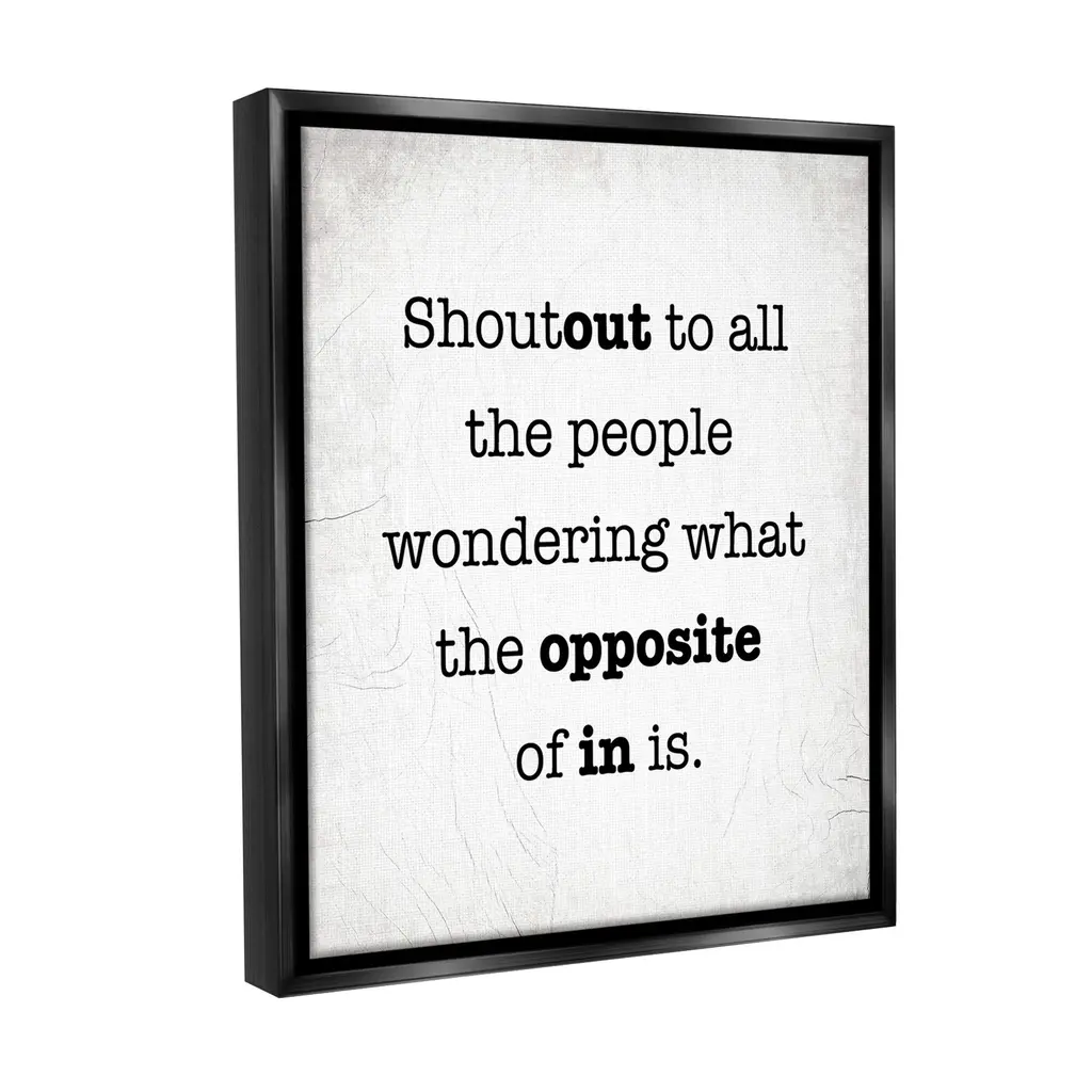 Elevate your home or office to the next level with Stupell Framed Floating Canvas Wall Art. Our premium hand-stretched canvas is mounted securely into a sturdy lightweight frame. The museum-style gap between the wrapped canvas and the box frame gives the illusion of floating artwork. Stupell Wall Art is made in the USA.Features: Dimensions: 17 x 1.7 x 21 Frame, 16 x 1.5 x 20 Canvas ArtFloating Frame Canvas Products are available in sizes 17"x21" and 25"x31". All Floating Frame Canvas Products have a 1.7" Depth.Wall Art is Ready to Hang with Hardware Free Hanging. No Installation required. For Easy Set Up Lean or Layer Artwork on Shelf or Against Wall. Artwork is Permently Fixed into the Frame.Our elevated 1.7" Thick Floating Frame is the perfect complement to our canvas style Wall Art. We use only the highest quality inks in house with industry leading printing solutions. Canvas is hand stretched over a durable wood foundation and then mounted securly into a Modern Box Frame. Made in the USA.Artwork Relates To: Phrase, Humor, Funny, Rustic, Sassy, Shoutout to all the People Wondering What the Opposite of In IsDesign by Lil' Rue