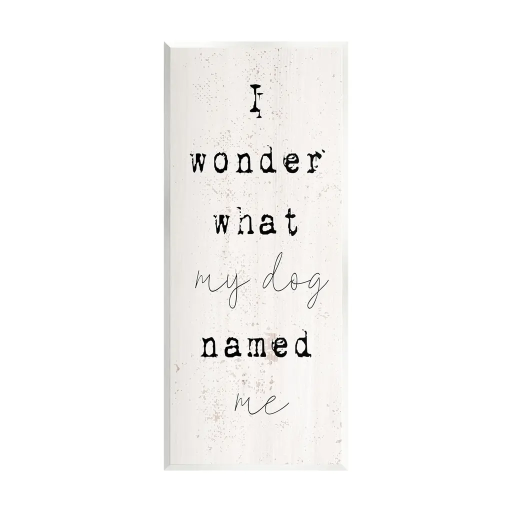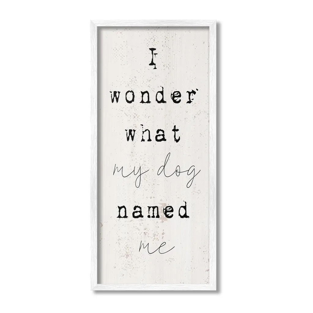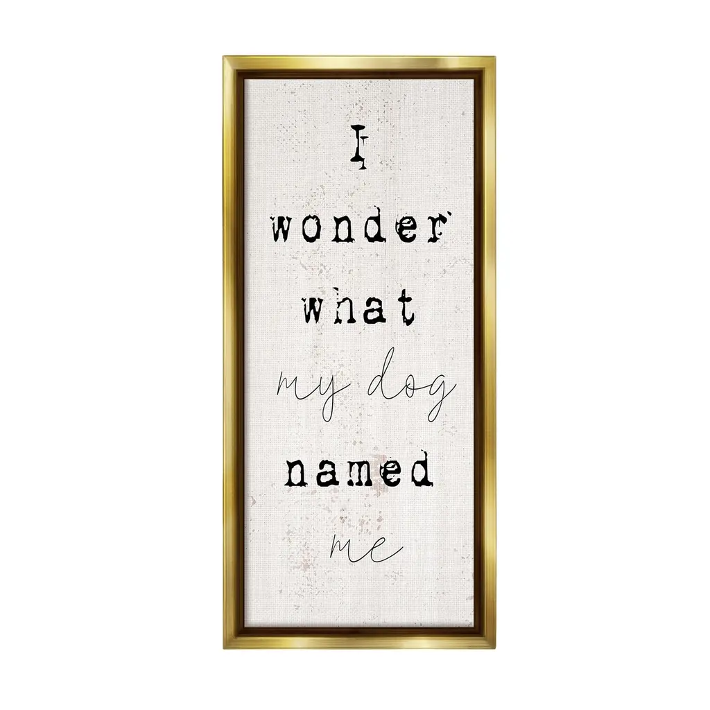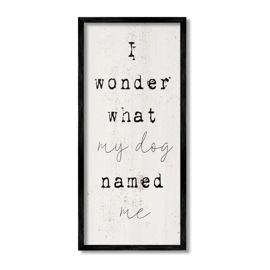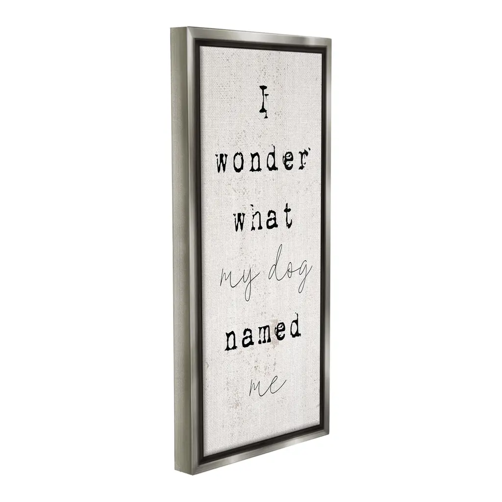 Elevate your home or office to the next level with Stupell Framed Floating Canvas Wall Art. Our premium hand-stretched canvas is mounted securely into a sturdy lightweight frame. The museum-style gap between the wrapped canvas and the box frame gives the illusion of floating artwork. Stupell Wall Art is made in the USA.Features: Dimensions: 11 x 1.7 x 25 Frame, 10 x 1.5 x 24 Canvas ArtFloating Frame Canvas Products are available in sizes 11"x25" and 14"x31". All Floating Frame Canvas Products have a 1.7" Depth.Wall Art is Ready to Hang with Hardware Free Hanging. No Installation required. For Easy Set Up Lean or Layer Artwork on Shelf or Against Wall. Artwork is Permently Fixed into the Frame.Our elevated 1.7" Thick Floating Frame is the perfect complement to our canvas style Wall Art. We use only the highest quality inks in house with industry leading printing solutions. Canvas is hand stretched over a durable wood foundation and then mounted securly into a Modern Box Frame. Made in the USA.Artwork Relates To: Phrase, Rustic, Pet, Dog, Humor, I Wonder What my Dog Named MeDesign by Lil' Rue