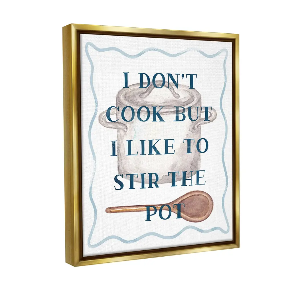 Elevate your home or office to the next level with Stupell Framed Floating Canvas Wall Art. Our premium hand-stretched canvas is mounted securely into a sturdy lightweight frame. The museum-style gap between the wrapped canvas and the box frame gives the illusion of floating artwork. Stupell Wall Art is made in the USA.Features: Dimensions: 17 x 1.7 x 21 Frame, 16 x 1.5 x 20 Canvas ArtFloating Frame Canvas Products are available in sizes 17"x21" and 25"x31". All Floating Frame Canvas Products have a 1.7" Depth.Wall Art is Ready to Hang with Hardware Free Hanging. No Installation required. For Easy Set Up Lean or Layer Artwork on Shelf or Against Wall. Artwork is Permently Fixed into the Frame.Our elevated 1.7" Thick Floating Frame is the perfect complement to our canvas style Wall Art. We use only the highest quality inks in house with industry leading printing solutions. Canvas is hand stretched over a durable wood foundation and then mounted securly into a Modern Box Frame. Made in the USA.Artwork Relates To: Cutlery, Spoon, Kitchen Utensil, Wooden Spoon, Funny, Humor, I Don't Cook But I Like To Stir The PotDesign by Lil' Rue