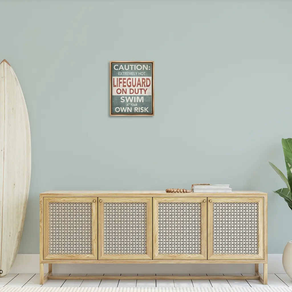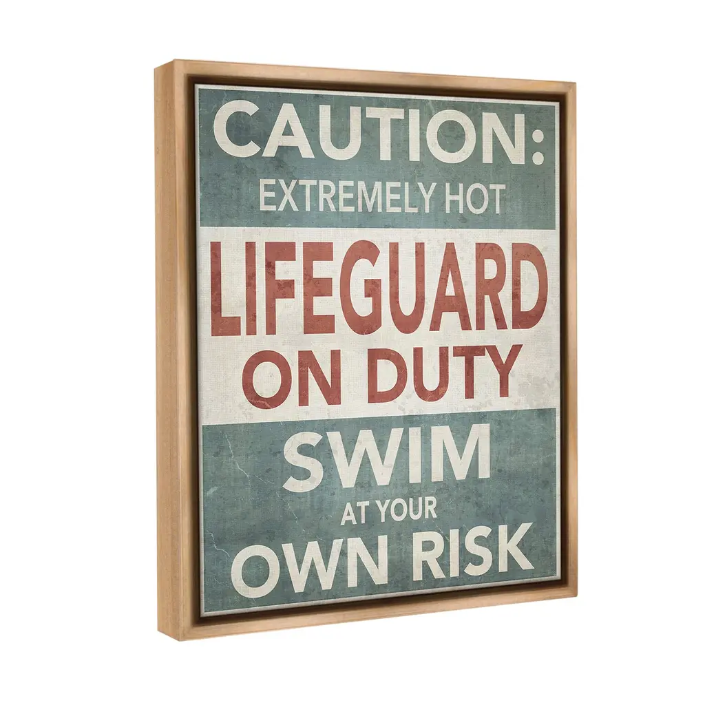Elevate your home or office to the next level with Stupell Framed Floating Canvas Wall Art. Our premium hand-stretched canvas is mounted securely into a sturdy lightweight frame. The museum-style gap between the wrapped canvas and the box frame gives the illusion of floating artwork. Stupell Wall Art is made in the USA.Features: Dimensions: 17 x 1.7 x 21 Frame, 16 x 1.5 x 20 Canvas ArtFloating Frame Canvas Products are available in sizes 17"x21" and 25"x31". All Floating Frame Canvas Products have a 1.7" Depth.Wall Art is Ready to Hang with Hardware Free Hanging. No Installation required. For Easy Set Up Lean or Layer Artwork on Shelf or Against Wall. Artwork is Permently Fixed into the Frame.Our elevated 1.7" Thick Floating Frame is the perfect complement to our canvas style Wall Art. We use only the highest quality inks in house with industry leading printing solutions. Canvas is hand stretched over a durable wood foundation and then mounted securly into a Modern Box Frame. Made in the USA.Artwork Relates To: Phrase, Humor, Nautical, Beach, Rustic, Vintage, Lake, Caution, Extremely Hot Lifeguard on Duty, Swim at Your Own RiskDesign by GraffiTee Studios