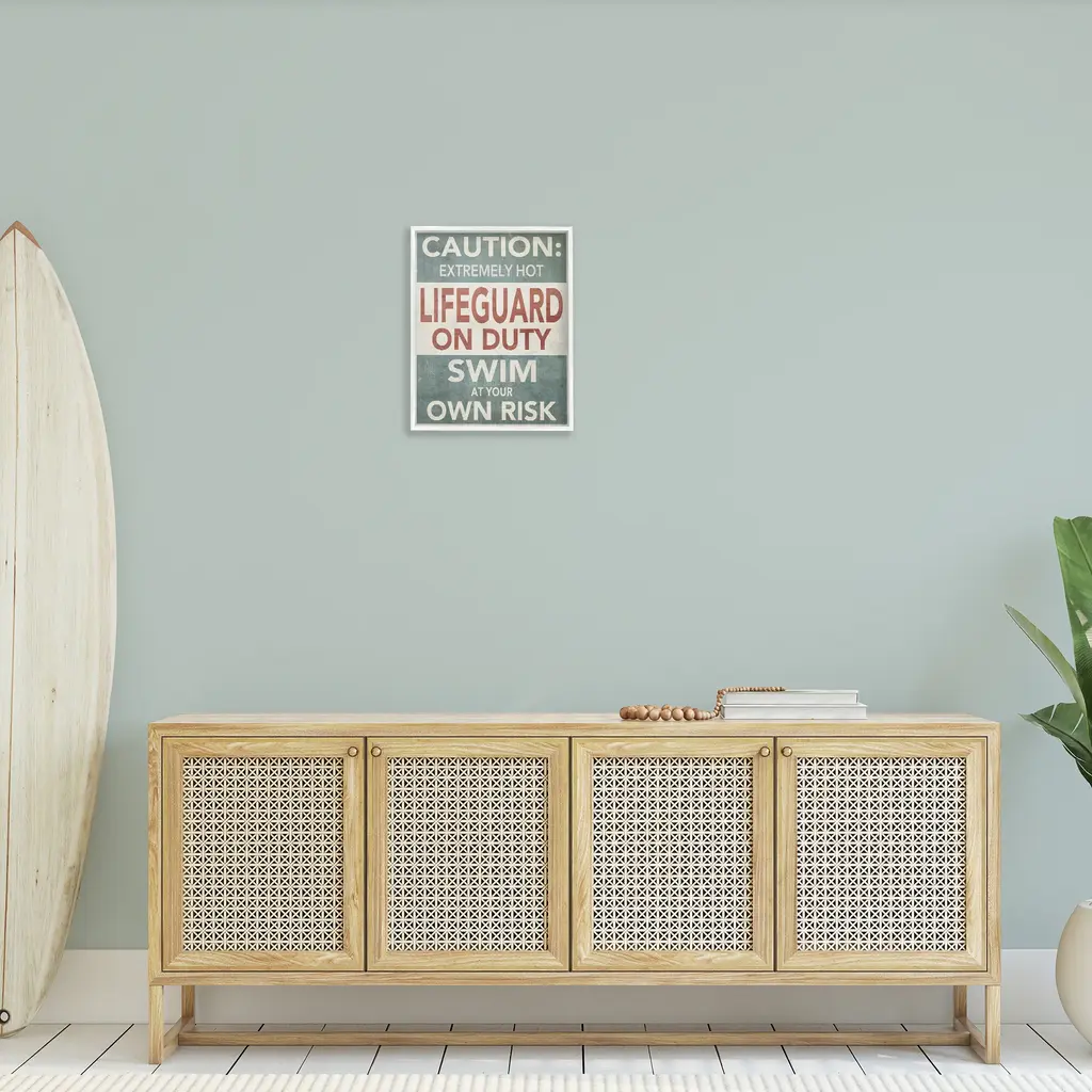 Add dimension to any room with our textured Framed Giclee Artwork. Our framed artwork is securely mounted into a 1.5-inch thick wood grain frame and ready to hang. Frames are available in three alluring styles: black, gray farmhouse and white. In addition, you should check out our oversized options if you want a statement piece. Stupell Wall Art is made in the USA.Features: Dimensions: 11 x 1.5 x 14 FramedFramed Giclee Products are available in the sizes 11"x14", 16"x20" or 24"x30". All Framed Giclee Products have a 1.5" Depth. Wall Art is Ready to Hang with Hardware Free Hanging. No installation required. For Easy Set Up Lean or Layer Artwork on Shelf or Against Wall.Our giclée prints are carefully mounted on a durable MDF backing, and then perfectly finished in a 1.5 inch thick woodgrain frame. Mounted frame colors include black, gray farmhouse and white. Made In USA.Artwork Relates To: Phrase, Humor, Nautical, Beach, Rustic, Vintage, Lake, Caution, Extremely Hot Lifeguard on Duty, Swim at Your Own RiskDesign by GraffiTee Studios