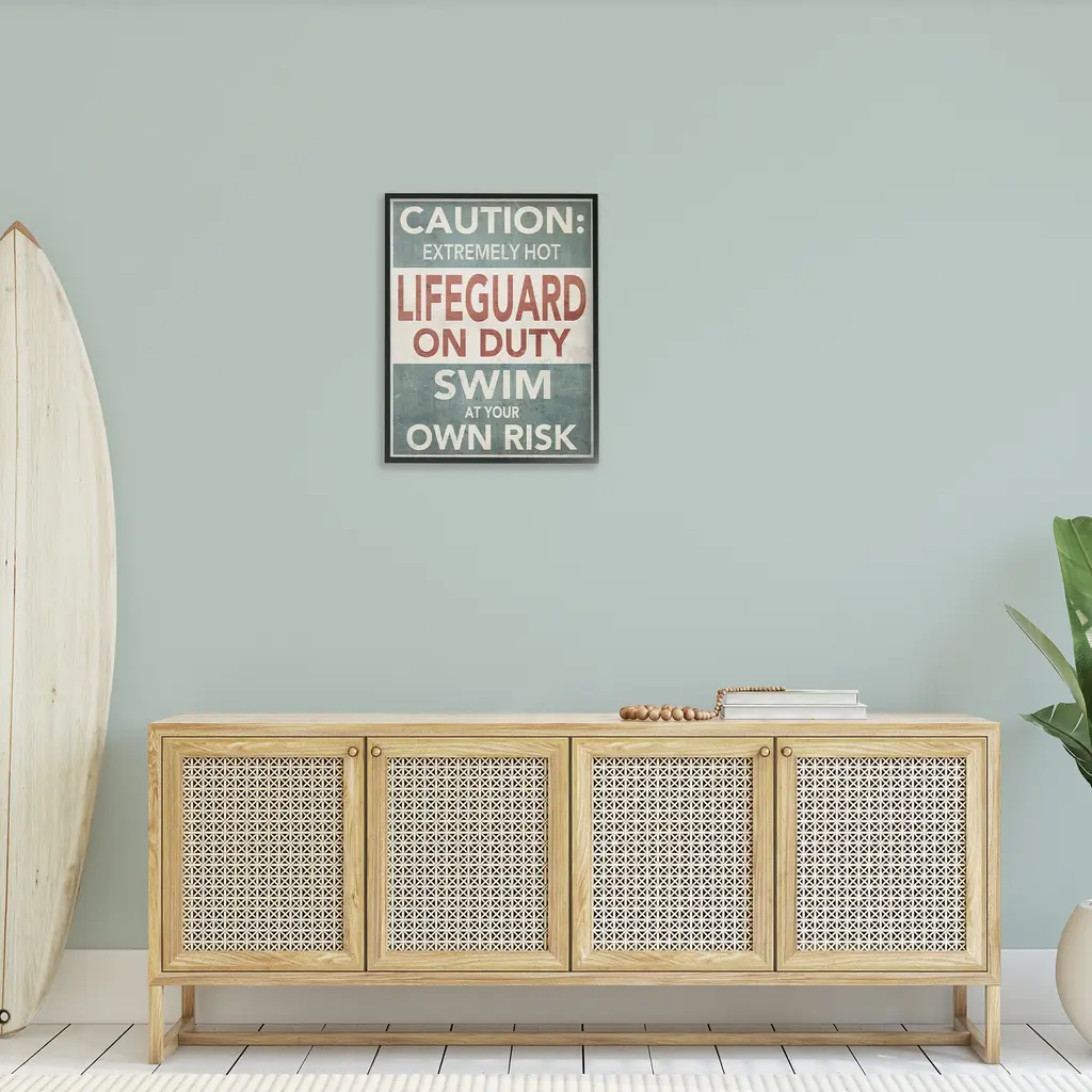 Add dimension to any room with our textured Framed Giclee Artwork. Our framed artwork is securely mounted into a 1.5-inch thick wood grain frame and ready to hang. Frames are available in three alluring styles: black, gray farmhouse and white. In addition, you should check out our oversized options if you want a statement piece. Stupell Wall Art is made in the USA.Features: Dimensions: 11 x 1.5 x 14 FramedFramed Giclee Products are available in the sizes 11"x14", 16"x20" or 24"x30". All Framed Giclee Products have a 1.5" Depth. Wall Art is Ready to Hang with Hardware Free Hanging. No installation required. For Easy Set Up Lean or Layer Artwork on Shelf or Against Wall.Our giclée prints are carefully mounted on a durable MDF backing, and then perfectly finished in a 1.5 inch thick woodgrain frame. Mounted frame colors include black, gray farmhouse and white. Made In USA.Artwork Relates To: Phrase, Humor, Nautical, Beach, Rustic, Vintage, Lake, Caution, Extremely Hot Lifeguard on Duty, Swim at Your Own RiskDesign by GraffiTee Studios
